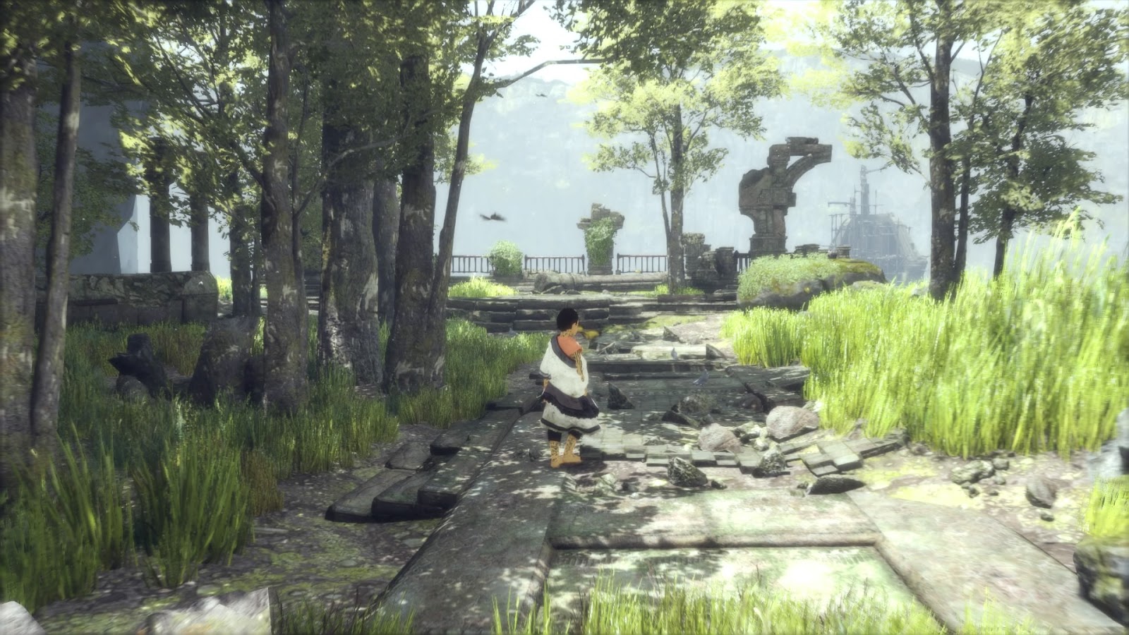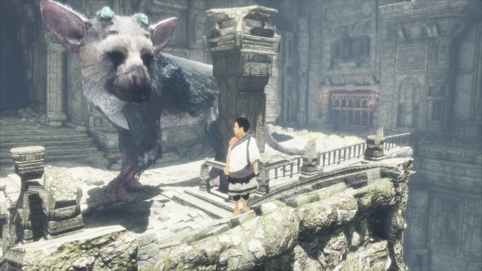 Te wszystkie mankamenty nie przeszkadzają grze wyglądać rewelacyjnie. Nie pobiegamy swobodnie po terenach w których jesteśmy uwiezieni, ale skala poziomów jest ogromna i często z daleka widzimy obszary, do których w późniejszym etapie gry dotrzemy. Widoki często zapierały mi dech w piersi, ale niekoniecznie zaawansowanymi technikami renderowania, ale właśnie artyzmem i skalą. A żeby ukończyć grę, niejednokrotnie musiałem mocniej ruszyć mózgownicą. Zapomniałem już o takich momentach, w których po prostu utknąłem w grze :) i musiałem na spokojnie ogarnąć wszystko co jest dookoła, sprawdzić otoczenie, zwrócić uwagę na to, co akurat robi Trico, wpaść na pomysł i go jeszcze dobrze wykonać. Często rozwiązanie polega na świetnie przemyślanej fizyce, która napędza całą grę. Zachowanie poszczególnych materiałów i przedmiotów w grze, jak i naszego pierzastego kompana jest naturalne i wypada bardzo przekonująco. Wszystko co znajduje się w grze ma swój ciężar i odpowiednie właściwości, dzięki czemu z pełną immersją przeżywałem całą grę. A najwięcej radochy, emocji, wrażeń i uczuć dostarcza właśnie Trico.