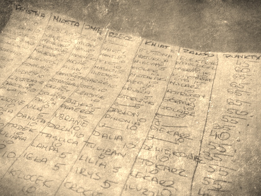 Ta gra zeszytowa jak żadna inna, sprawdzała naszą wiedzę z wielu dziedzin, z czasem do gry dochodziły inne kategorie, jak: Zwierzę, rzecz, roślina, czy potrawa, w tej grze, nie pomagało szczęście, a wiedza. Gra polegająca na wyszukaniu słów z różnych dziedzin zaczynających się na daną literę i zapisywaniu ich kto pierwszy. Przed przystąpieniem do gry uczestnicy ustalali dziedziny, z jakich będą wyszukiwać słowa. Na zajęciach trudno było w nią grać, ponieważ trzeba było się cały czas komunikować.