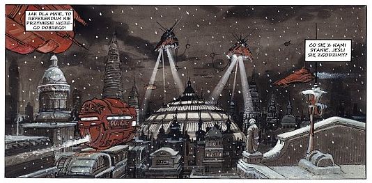 Nie pomaga tutaj też kreska. Zdarzają się ładne kadry, bo osobiście lubię francuski mainstream, ale zdarzają się rzadko. Pisałem już o beznadziejnych projektach postaci. Przykład? Twarz jakiegoś dyplomaty stojącego "w tle" podczas mianowania głównego bohatera na agenta wyglądała kuchenna cerata którą dziecko potraktowało nożyczkami. Leży również mimika twarzy. W kilku poważnych scenach najzwyczajniej w świecie chciało mi się śmiać z głupich min bohaterów. Kolejnym zarzutem jest kadrowanie. Czytasz, i nagle nie wiesz o co chodzi. Dlaczego? Bo przeczytałeś nie to co trzeba. Takie akcje miałem kilka razy. Wisienką na torcie są onomatopeje. A raczej nie są, bo wtedy kiedy są potrzebne po prostu ich nie ma. Jeśli jest narysowany wielki wybuch to napis "BOOOM" powinien być na pół kadru, a w Orbitalu wszystkie sceny akcji były nieme. Byłbym zapomniał o kolorystyce. Rysownik mając taki potencjał walnął wszystko na szaro bure barwy. W Killzonie się sprawdzały, w Orbitalu męczyły. A najgorsze jest to że widać że jakby gościowi się chciało to narysowałby to o wiele lepiej.