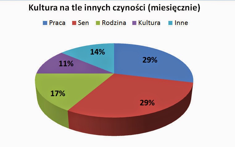 Z moich statystycznych obliczeń wynika, że w ciągu miesiąca sen i praca zabierają mi połowę czasu. Czy jestem tym zaskoczony? Raczej nie, bo przecież muszę za coś kupować moje kulturowe zakupy:). Na kulturę przeznaczam, 81 godzin, czyli ponad 3 dni w miesiącu. Poniżej możecie zobaczyć szczegółowy diagram z rozkładem kultury. Spodziewaliście się że gry stanowią największy udział? Z rodziną spędzam 5 dni w miesiącu. Nie jest źle, bo zawsze mogło być lepiej. W kategorii inne zawarłem czynności, których nie da się jednoznacznie skategoryzować ale nie są one bez znaczenia, bo jak widać stanowią 13% całości. Do tej kategorii należy zaliczyć np. zakupy, internet, higiena, aktywność fizyczna, jedzenie itp.