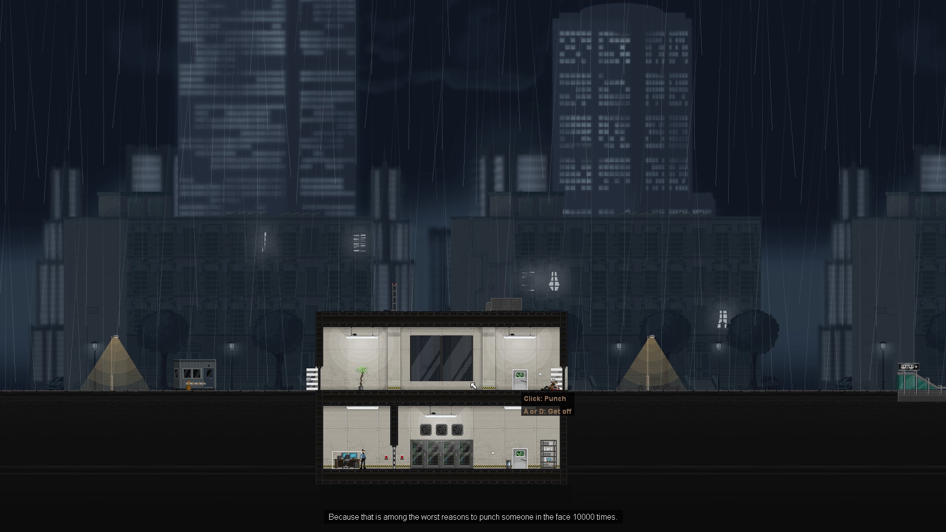 Defenestracji - tylko tym razem bez przedrostka - będziemy też dokonywali na przeciwnikach, którzy nieopatrznie zbliżyli się do tych - jak widać - niebezpiecznych powierzchni płaskich. Ewentualnie można na nich naskoczyć i zacząć okładać. Bardzo dużo razy. To znaczy, technicznie rzec biorąc wystarczy uderzyć takiego delikwenta raz, ale różnie z tym bywa. W ostateczności jest też możliwość zastrzelenia oponenta, ale odpala to odliczanie, po którego zakończeniu nie da się ukończyć poziomu, bo policyjny snajper ustrzeli nas wtedy zawsze i bez ostrzeżenia. W ogóle bez ulepszeń protagonista ginie od jednej kulki, a nawet ulepszenie nie daje gwarancji na to, że wyjdziemy z opresji cali i zdrowi - jedyne, co robi, to zwiększa szanse na ominięcie pocisku, a nie zapewnia ochronę przed nim.
