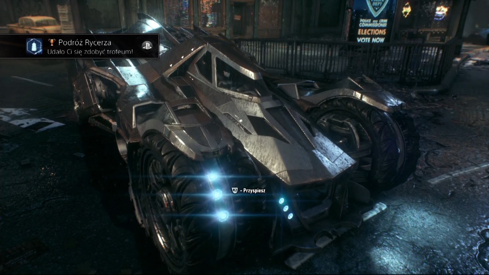 Nowością, która urozmaica i pomaga w poruszaniu się po Gotham jest słynny Batmobil, który widać był mocno inspirowany wozem Batmana z filmowej trylogii Nolana. Bryka Gacka, to istny czołg, który w dowolnym momencie może zmienić się w maszynę śmierci… znaczy ogłuszania, przechodząc w tryb bojowy oddając w ręce kierowcy działko maszynowe, wyrzutnię pocisków wybuchowych, moduł włamywania się do dronów oraz kilka innych gadżetów. Poza wspomaganiem poruszania się po mieście, Batmobil również otwiera Batmanowi niedostępne drogi, których co ciekawe jest tak sporo, że w pewnym momencie można zadać sobie pytanie „Jak Bruce sobie wcześniej radził bez tego Batmobilu?!” Pojazd Batmana również otrzymał specjalnych przeciwników - bezosobowe pojazdy dowodzone przez Arkham Knighta. Popatrzmy na to logicznie… Jeżeli Rycerz Arkham chciałby załatwić Gacka raz na zawsze (a podobno dobrze go zna), mógł wysłać na niego armię czołgów sterowanych przez ludzi, bo wtedy miałby problem z niszczeniem pojazdów, gdyż przed zniszczeniem musiałby dodatkowo uratować siedzących w środku zbirów… Ale wróćmy do walki z dronami. Jest to bez wątpienia dosyć kontrowersyjny element gry. Widać, że został on wprowadzony na siłę. Walkę rozpoczynamy od przejścia w stan bojowy, w którym Batmobil porusza się z kocią zwinnością - koła obracają się o 360 stopni! - po czym możemy zabrać się za likwidowanie pojazdów.