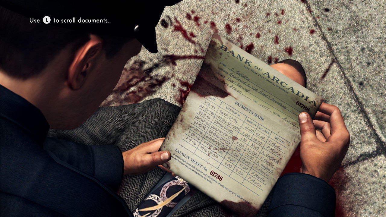 Wracając jednak do eksploracji, muszę wspomnieć o istotnej opcji, która jest de facto przyjemnym ułatwieniem. Otóż poruszając się po miejscu zbrodni zaczyna grać charakterystyczna muzyka, która w momencie zbliżenia się do potencjalnego dowodu jest coraz bardziej rytmiczna, zaś kontroler wibruje. Czując wibracje i słysząc muzykę należy zatrzymać się i podnieść rzecz, która je spowodowała. Oczywiście nie każdy przedmiot zostanie zapisany w notatniku prowadzonym przez śledczego. Gdy jednak znaleziona rzecz okaże się pomocna, zostanie ona automatycznie wpisana, więc nie musimy się niczego obawiać. Z niektórymi znaleziskami możemy wchodzić w bliższą interakcję. Przykładowo, trzymając pistolet, możemy go obrócić w taki sposób, żeby przeczytać numer seryjny albo inną, pomocną rzecz, wszystko zależy od trzymanego w ręku przedmiotu. Tutaj również z pomocą przychodzą wibracje w kontrolerze DualShock 3 – w czasie obracania przedmiotu pad będzie wibrował, gdy w zasięgu wzroku pojawi się istotna informacja. Czasem przyjdzie nam również przeglądać wszelkiej maści makulaturę, jakieś teksty, prywatne korespondencje, listy czy rejestry z nazwiskami itp. Tutaj również za pomocą gałki analogowej będziemy musieli szukać dowodów – wystarczy, że najedziemy palcem i wciśniemy przycisk w miejscu, które wydaje nam się istotne (nazwisko, nazwa producenta itd.). Tak, jak poprzednio, nie trzeba się martwić, wszystko wpisze się w notesie automatycznie, więc na upartego można klikać na ślepo po wszystkich wyrazach. Oprócz przeglądania tekstów, okazjonalnie wejdziemy w interakcję z innymi przedmiotami w prostych, intuicyjnych mini-gierkach np. rysowanie ołówkiem po notesie, z którego wyrwano kartkę.