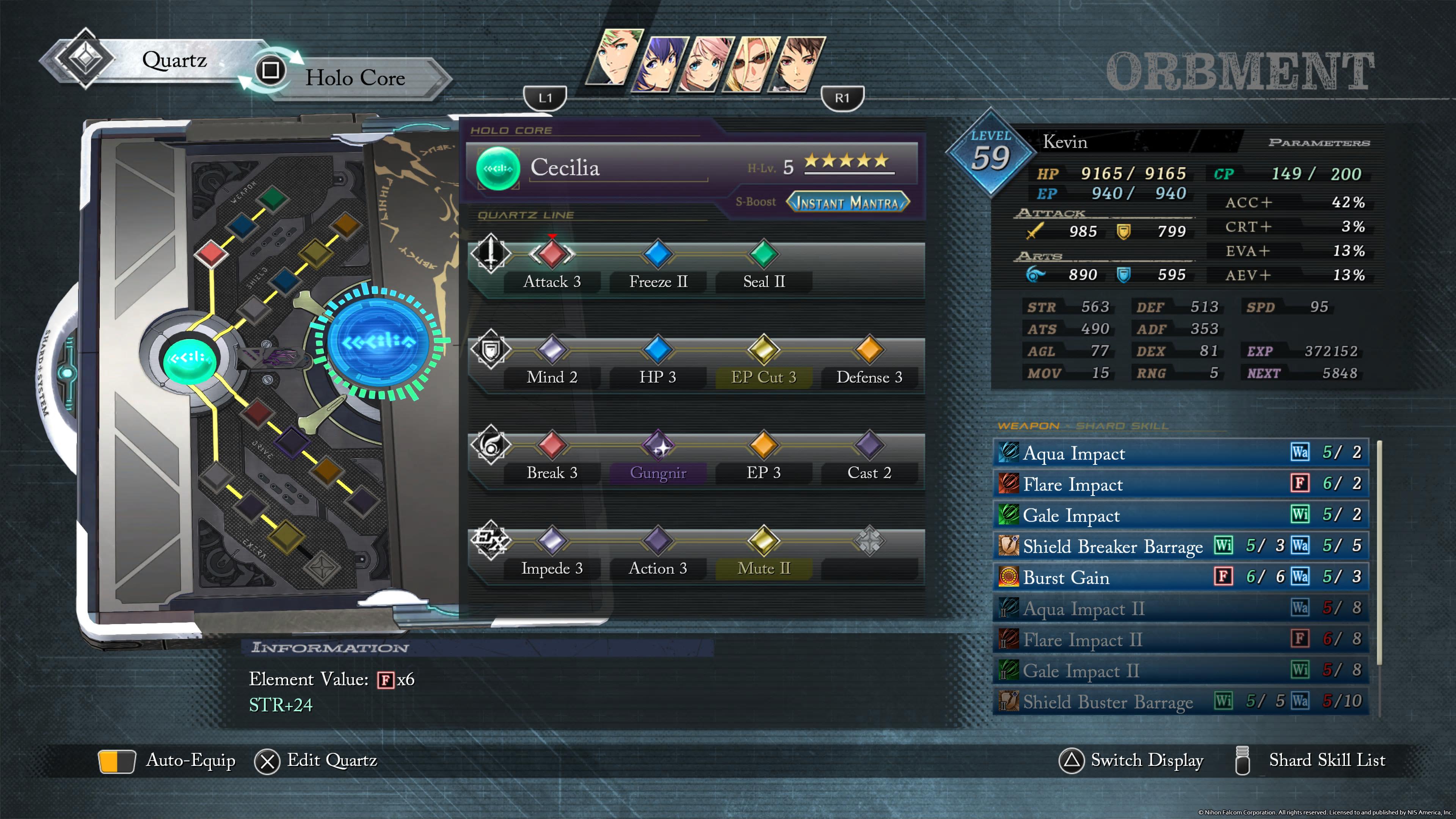 Znany z serii Cold Steel system magii uległ znaczącym zmianom i powrócił niejako do korzeni, czyli do rozwiązań z Trails in the Sky. Do naszej dyspozycji otrzymujemy urządzenia zwane Xipha. Składają się one z głównego rdzenia zwanego Holo Core, który możemy wymieniać na inne zdobyte w trakcie naszych wędrówek oraz z zamontowanych Kryształów (Quartz). Niestety rozwiązanie zastosowane w Daybreak 1, 2 i Horizon oceniam na minus, ponieważ nie będziemy już w stanie w pełni determinować zestawów zaklęć jakie będzie posiadać każda z naszych postaci. Zamiast tego każdy Holo Core oferuje predefiniowane czary, a my możemy jedynie uzupełnić je kilkoma dodatkowymi tzw. Pluginami. Ponadto montowane w urządzeniu Kryształy tworzą kombinacje umiejętności pasywnych tzw. Shard Skills. Mogą to być np. dodatkowe obrażenia od żywiołów, czy też wzmocniona ochrona przed konkretnym atakiem. Każdy Kryształ posiada też znane z poprzednich gier statystki np. HP, EP (Mana) lub efekty - Impede (opóźnienie ataków wroga), Burn (podpalenie), Cast (przyspieszenie rzucania zaklęć) itd. Całość niestety jest moim zdaniem mocno nieczytelna, a interfejs niepotrzebnie utrudnia poruszanie się po nim.
