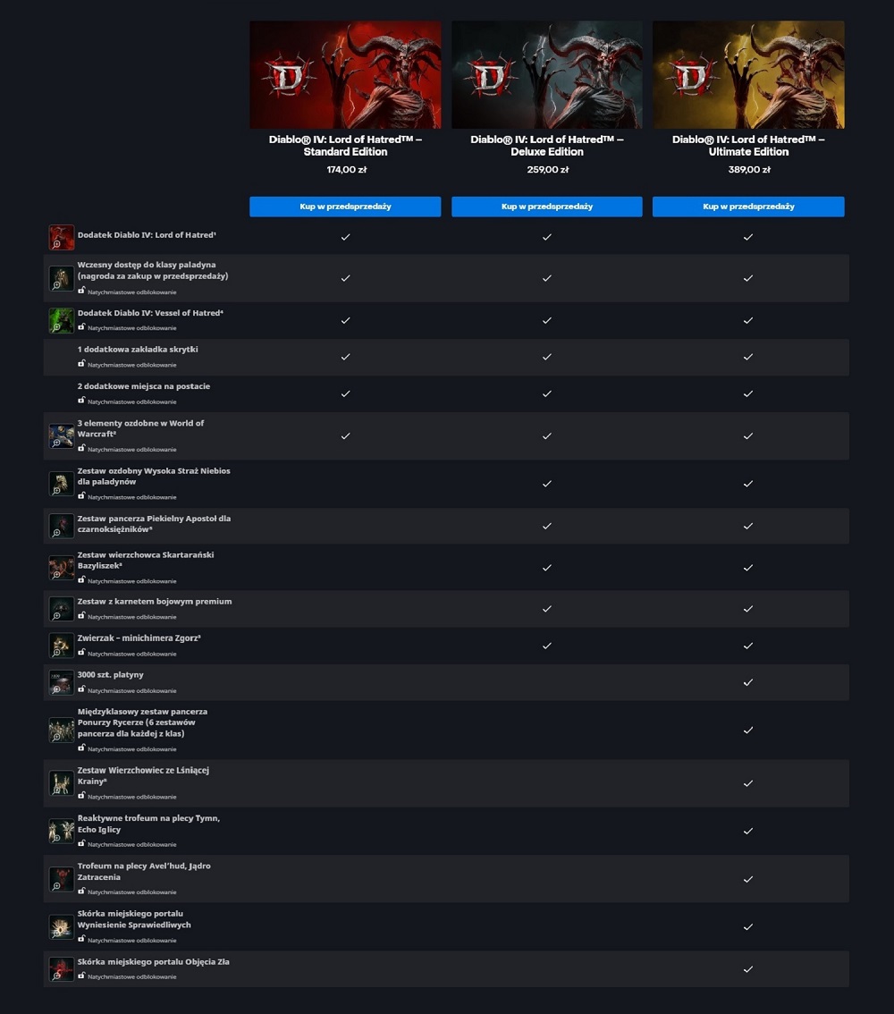 Do każdej wersji dodatku Lord of Hatred zakupionej w przedsprzedaży dodawany jest pierwszy dodatek Vessel of Hatred oraz jakieś rzeczy, które można odblokować już po jego zakupie w grze Diablo IV i World of Warcraft.