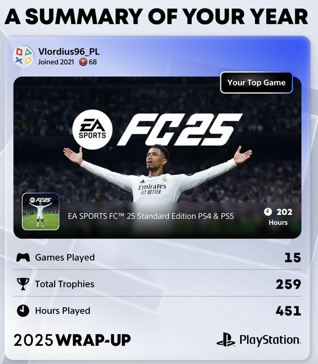 Jak co roku Sony udostępniło PlayStation Wrap-Up, czyli zestawienie, które podsumowuje nasze growe nawyki, ulubione tytuły i liczbę godzin spędzonych z padem. Zawsze lubię do niego zajrzeć — choćby po to, by odebrać nowy avatar i zobaczyć, jak naprawdę wyglądał mój rok na PlayStation. Podsumowanie możecie sprawdzić tutaj.