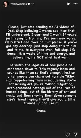 Zelda nie ukrywa obrzydzenia wobec trendów związanych z AI. Podkreśla, że dziedzictwo zmarłych twórców zamienia się w coś okropnego. Pełne emocji słowa mają wstrząsnąć odbiorcami i zachęcić do refleksji.