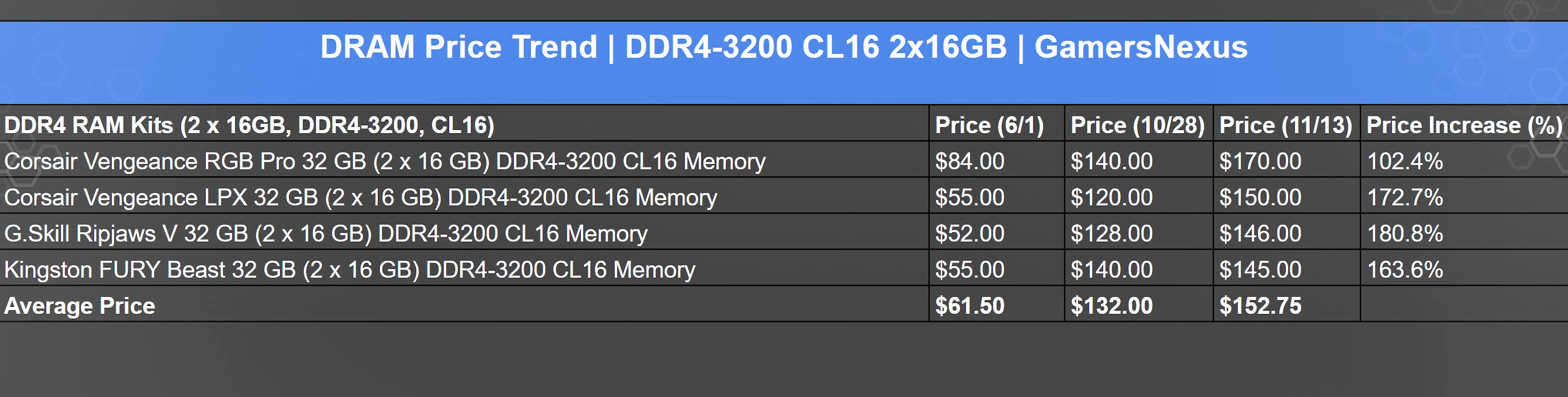 Redakcja Gamers Nexus w swoim kwieciście zatytułowanym filmiku "WTF?" mówi o "kompletnie zwariowanej sytuacji" z cenami pamięci RAM. W przypadku jednego modelu (T-Create Expert 32 GB DDR5) Gamer Nexus zauważył, że jego ceny wzrosły w zaledwie kilka miesięcy o 168%. Jeszcze gorzej sprawy się mają ze starszym typem pamięci DDR4, gdzie Gamers Nexus zarejestrował wzrost cen od czerwca 2025 roku nawet o 180%.