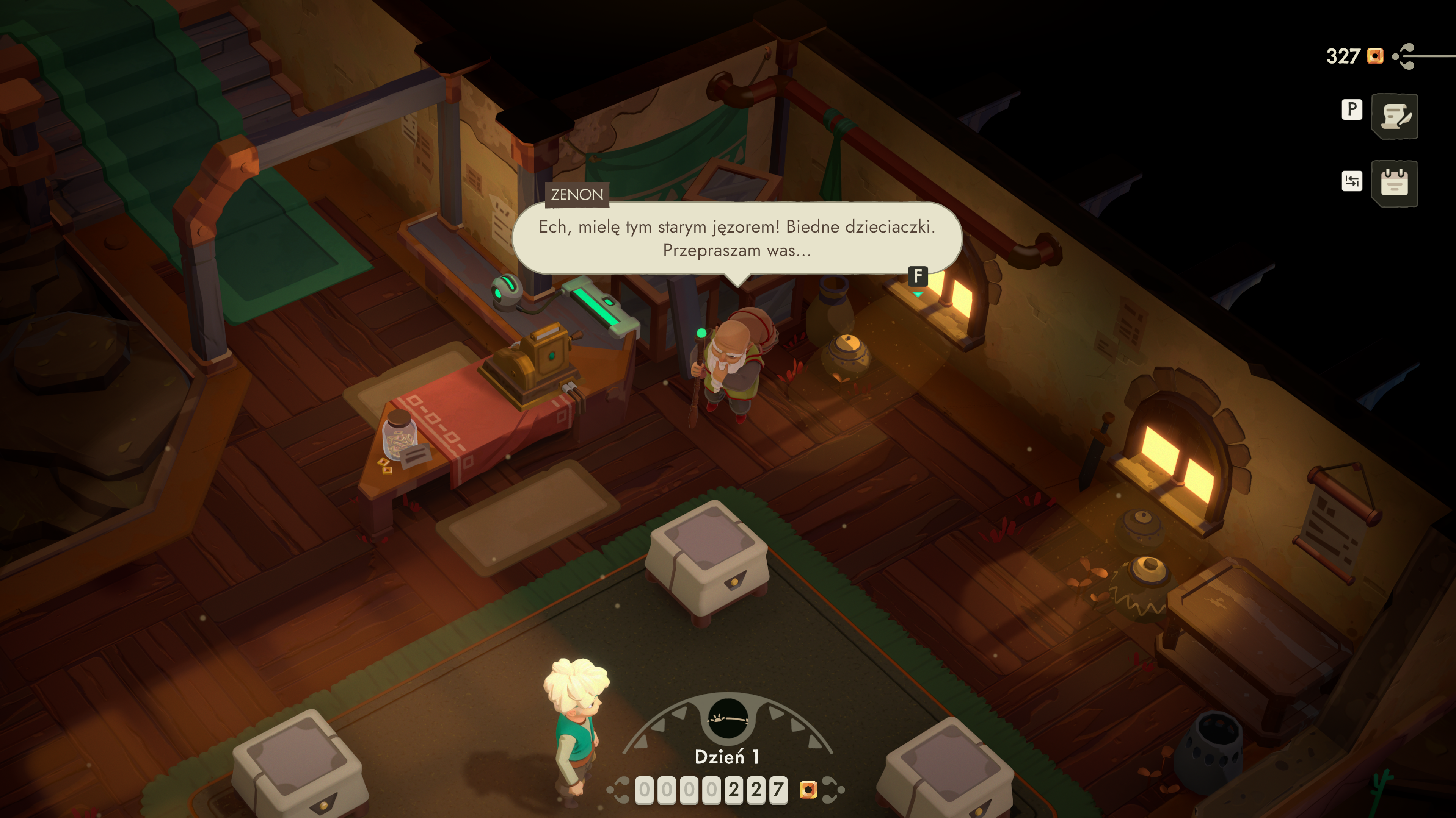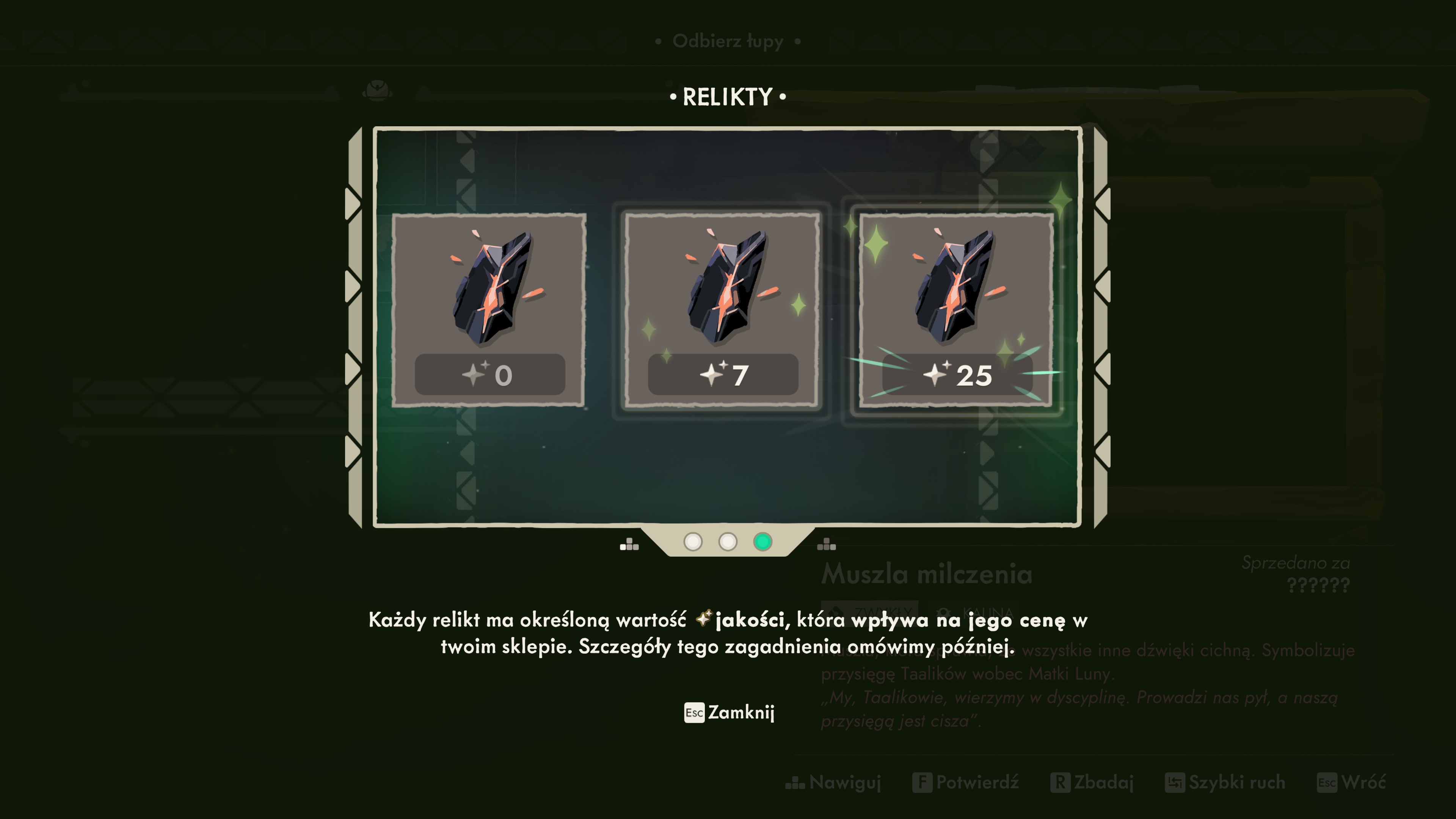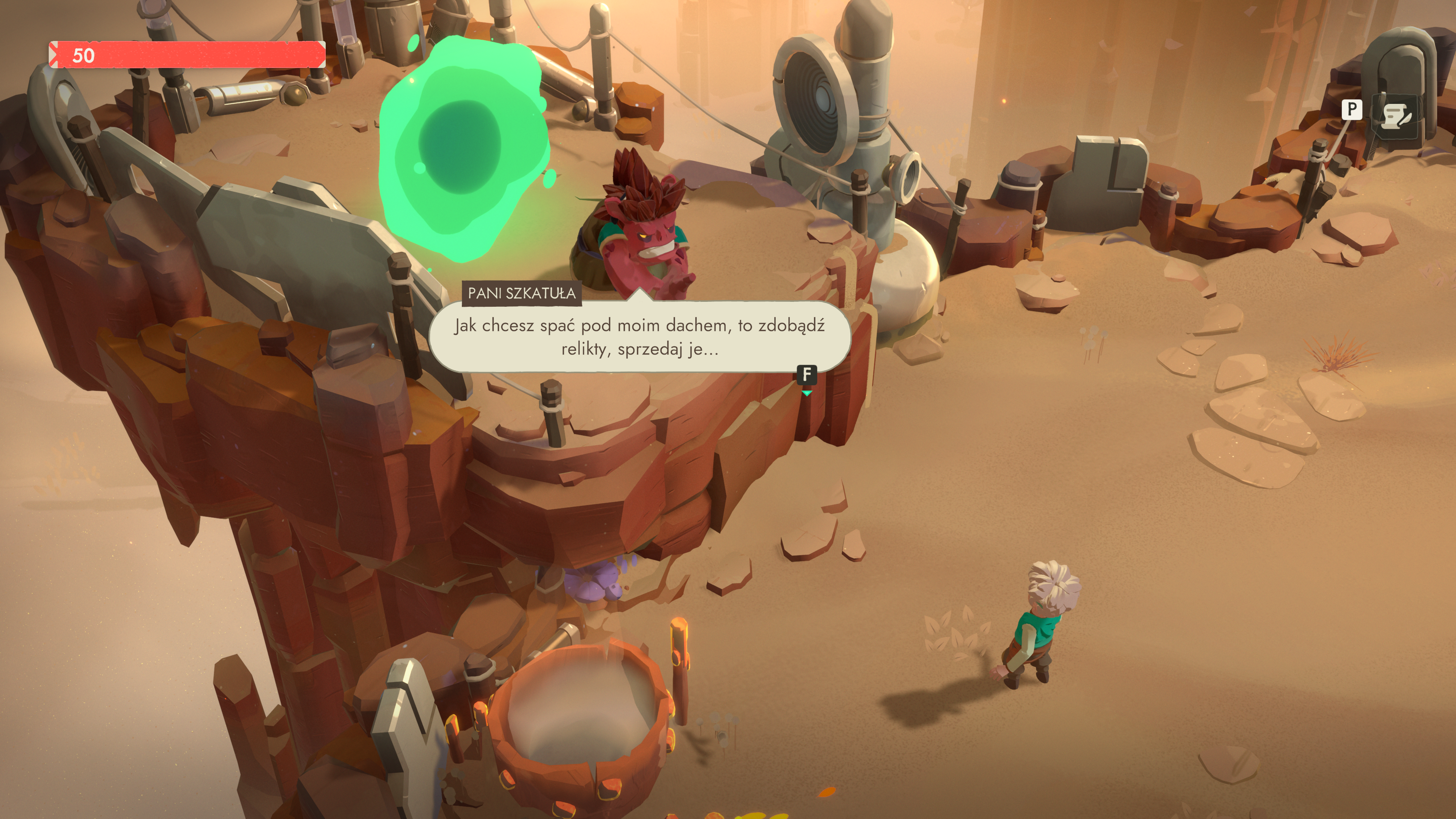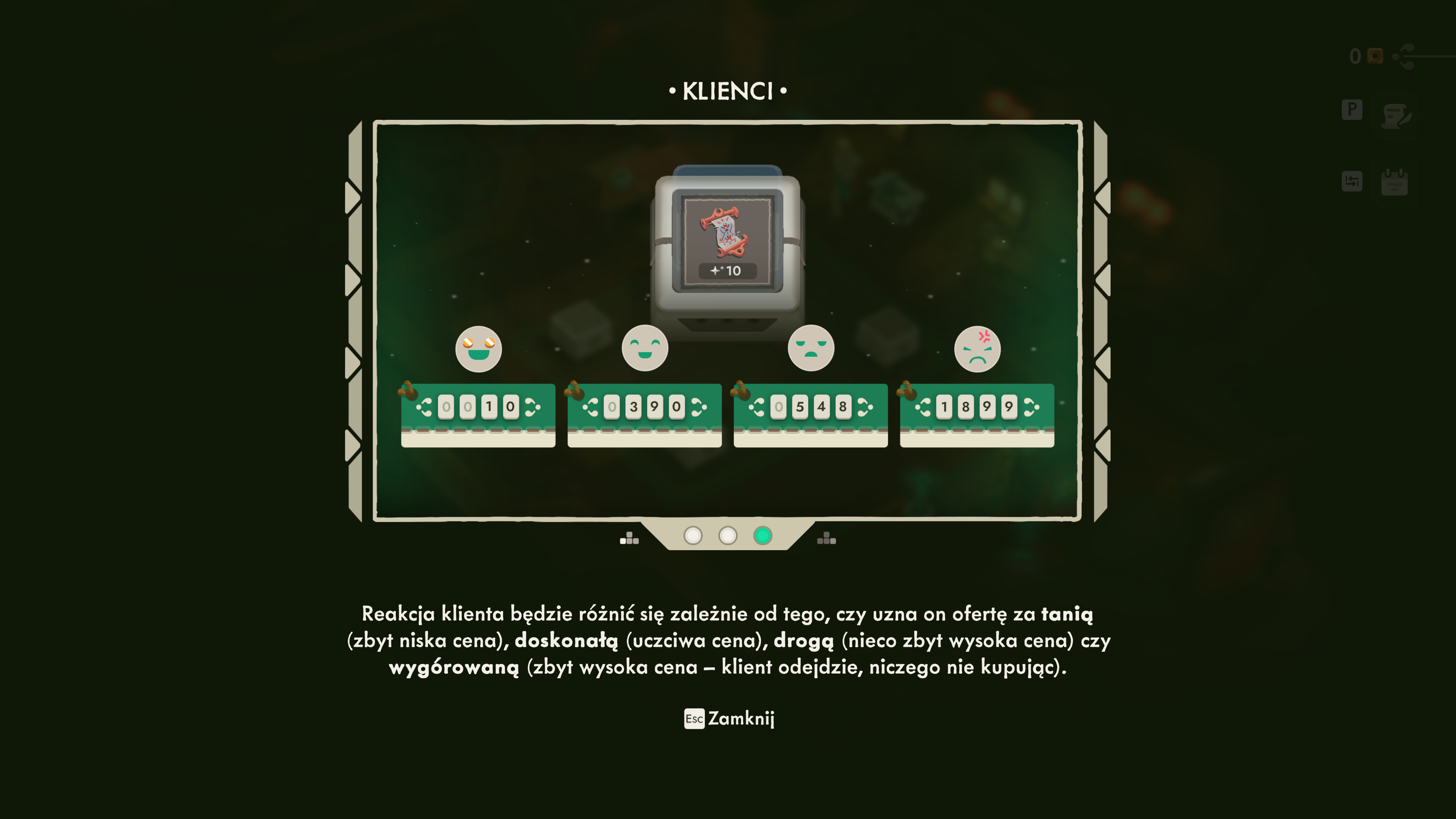 Największa zmiana dotyczy jednak sklepu – miejsca, które w jedynce było zabawną łamigłówką ekonomiczną, a w dwójce staje się pełnoprawnym systemem zarządzania biznesem. Tym razem ceny wyjściowe są mniej więcej ustalone, ale to ty decydujesz, jak bardzo chcesz manipulować marżą. Możesz korzystać z boostów, charmów, krótkich sekwencji QTE (czyszczenie przedmiotu przy kliencie), możesz prowadzić krótką rozmowę, która dosłownie przekona kupującego do zapłacenia więcej. A dodatkowe premie, które aktywują się o określonych porach dnia, potrafią całkowicie zmienić opłacalność danej partii towaru. W sklepie pojawiają się też pomocnicy – jak chociażby zwierzak dający tymczasowe buffy – oraz tajemnicza, pudełkowata istota, która wygląda jak prototyp kuriera do transportu łupu z długich wypraw. Ekonomia w Moonlighter 2 jest wielowarstwowa i dużo bardziej strategiczna. Często musimy się wykazać sprytem,