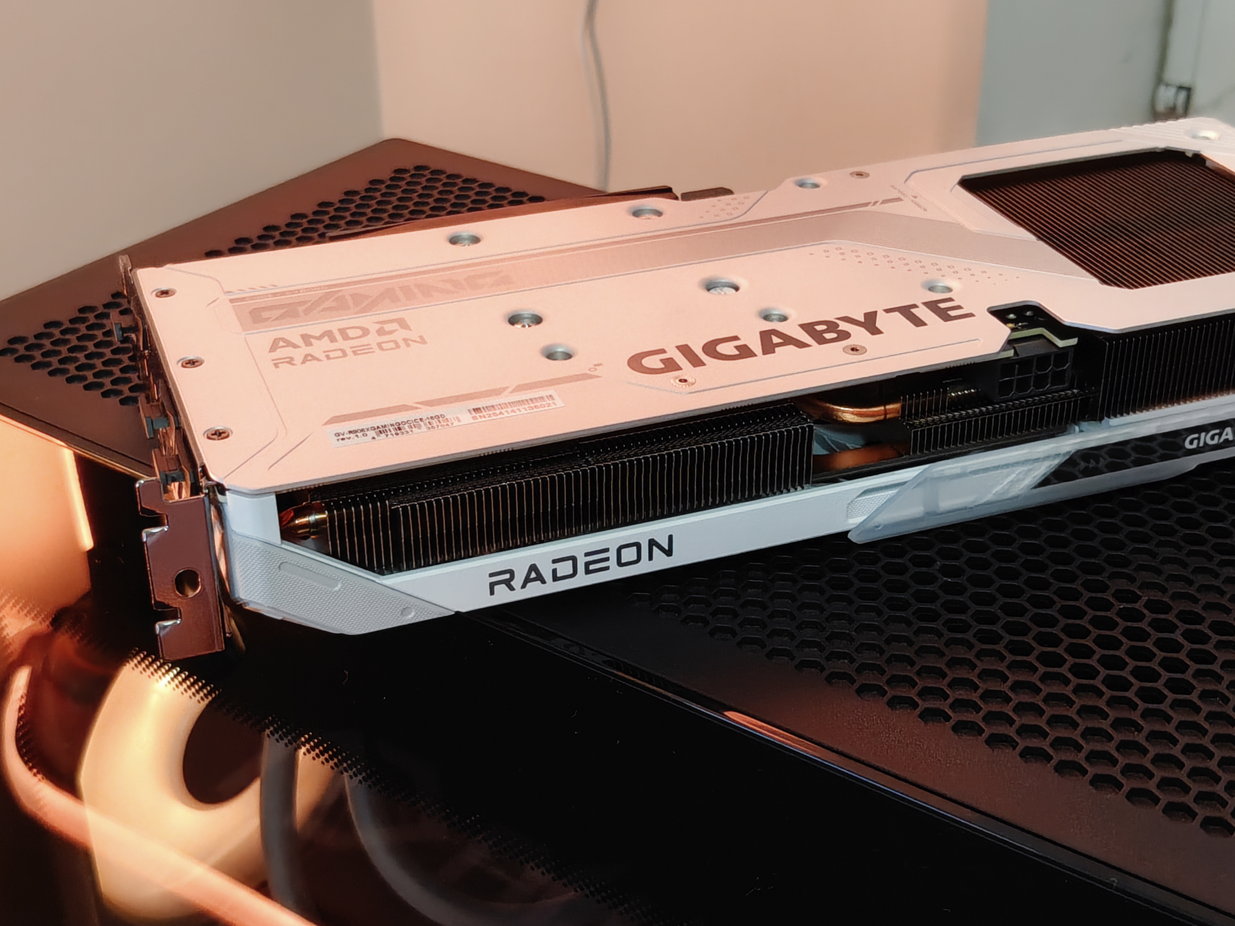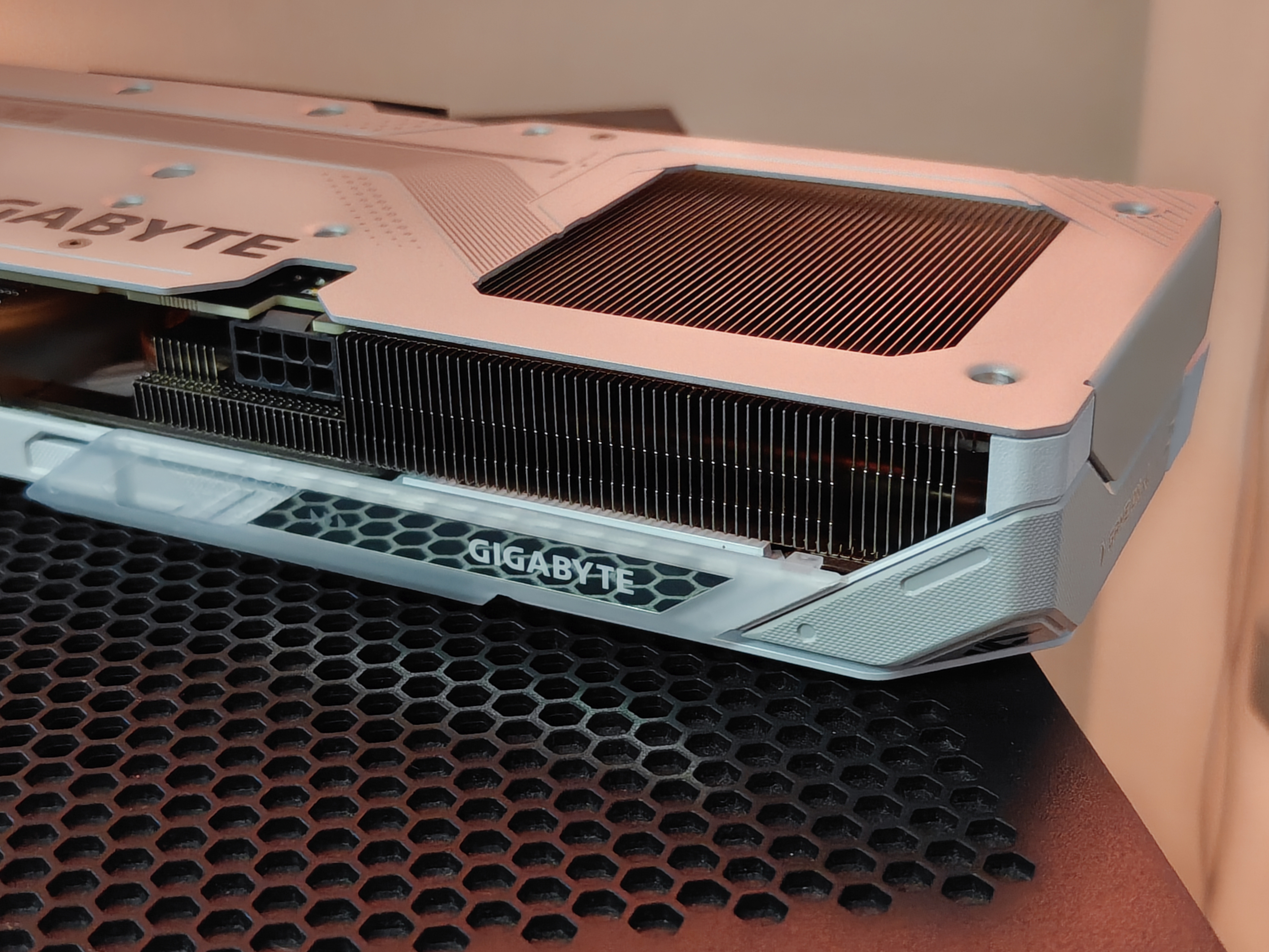 Karta zachowuje sprawdzone wymiary (nieco ponad 28 cm długości), zajmując dwa sloty w obudowie. Co ważne, jest stosunkowo lekka (850 g), dzięki czemu nie wymaga dodatkowego wspornika, by stabilnie siedzieć w slocie PCIe. Z boku znajdziemy subtelne podświetlenie ARGB z logo Gigabyte, którym można sterować za pomocą Gigabyte Control Center, nadając zestawowi unikalny charakter.