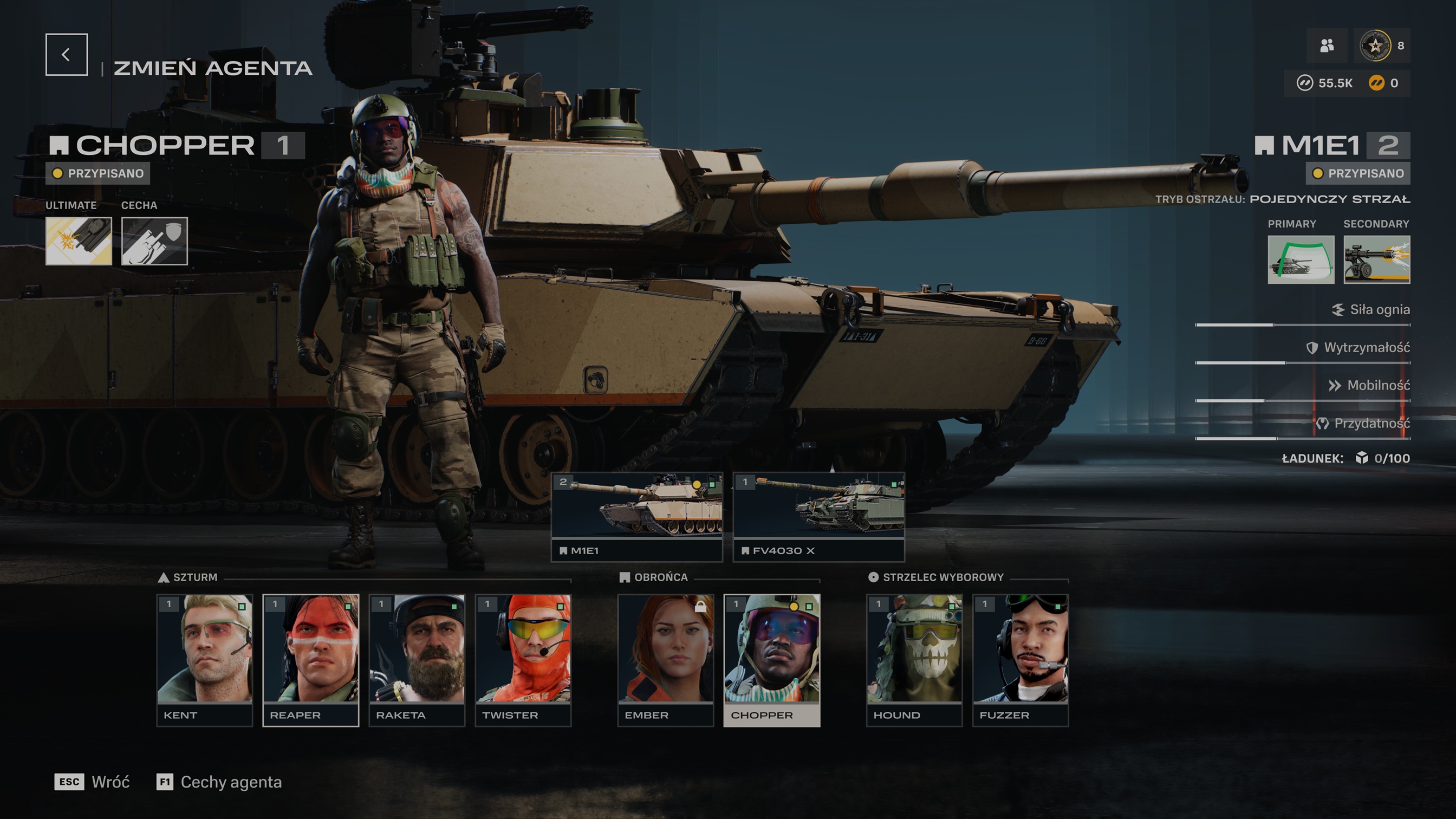 Pula pojazdów jest nierozerwalnie związana z postaciami, ponieważ każdy z Agentów posiada na ten moment przypisane do siebie dwie unikalne maszyny. Na start otrzymujemy natychmiastowy dostęp do podstawowego wozu, podczas gdy drugi wariant sprzętowy odblokowujemy naturalnie poprzez wbudowany system progresji konta. Wybór konkretnego modelu to zaledwie punkt wyjścia, ponieważ czołgi podlegają tu bardzo zaawansowanym modyfikacjom. Architektura ulepszeń pozwala precyzyjnie dostroić parametry defensywne i ofensywne do indywidualnego stylu prowadzenia starć.