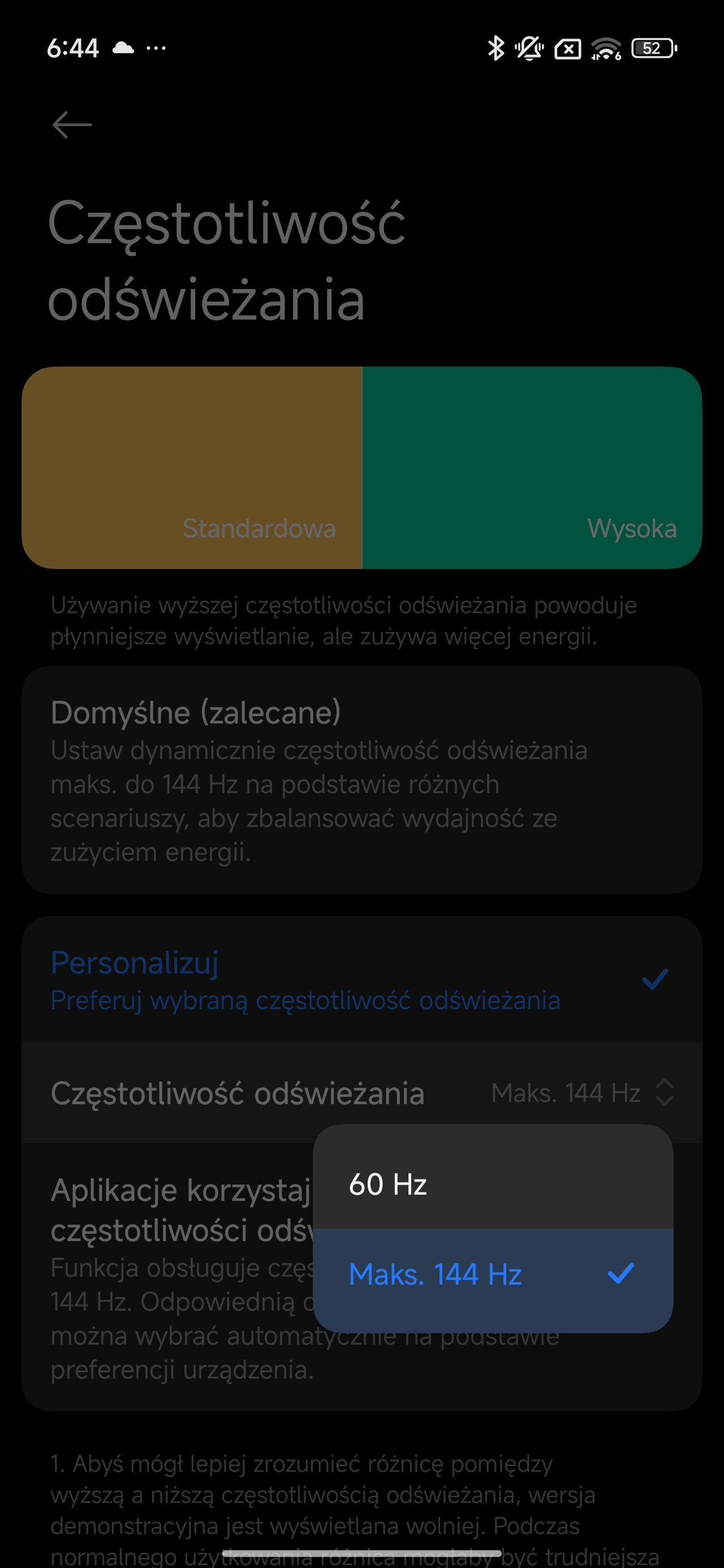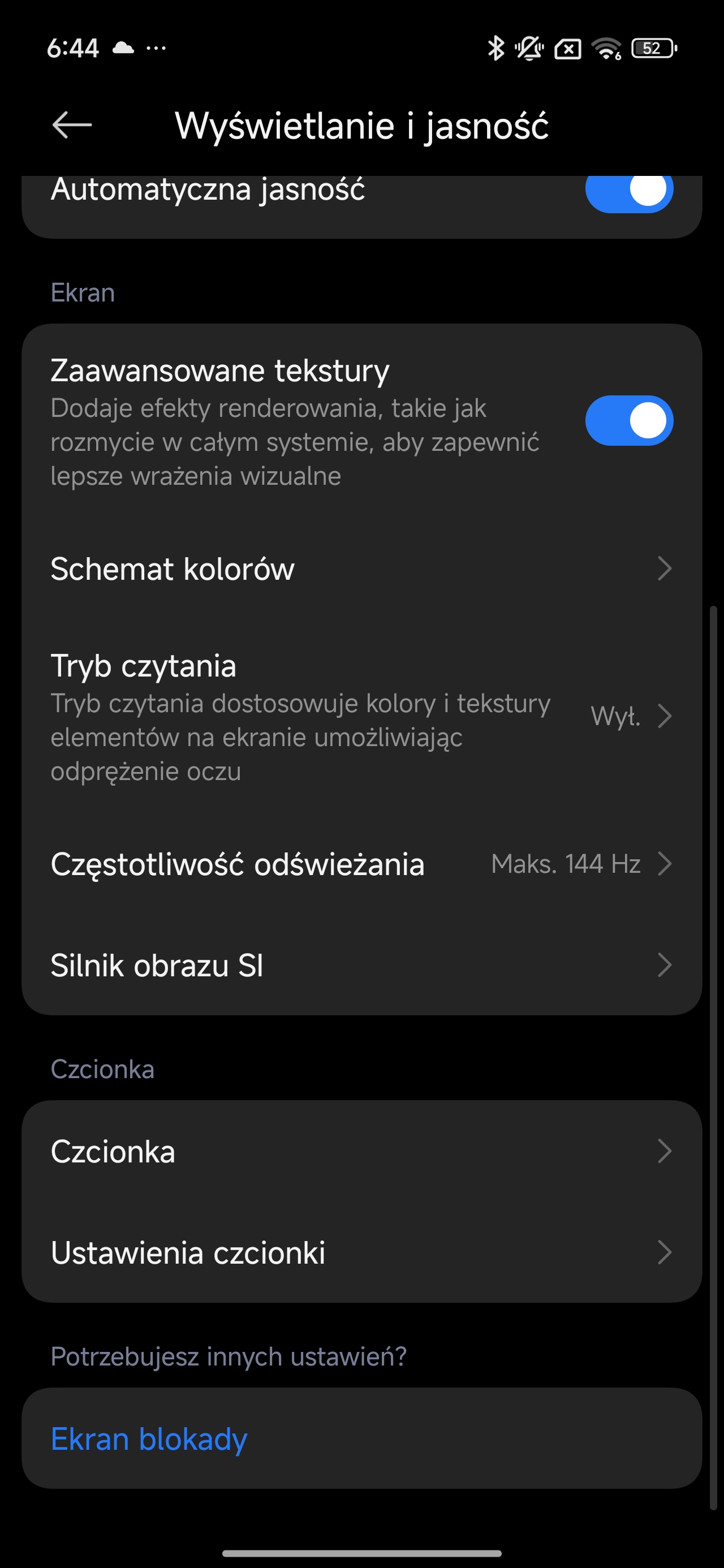Odświeżanie 144 Hz działa w trybie skokowym, ale w opcjach mamy do wyboru tylko 60 lub 144 Hz, więc nie jest to panel LTPO z płynną adaptacją, ale w praktyce nie robi to większej różnicy. W interfejsie i przeglądarce system śmiga aż miło, animacje są płynne, przewijanie responsywne, a niektóre osoby mające fioła na punkcie odświeżania faktycznie zauważą różnice między typowym panelem 120 Hz, a właśnie 144. Co też zauważyłem, większość gier działa w 120 Hz, ale w kilku udało się wymusić pełne 144 Hz (np. w Dead Cells+ czy Vainglory), co pokazuje, że Xiaomi nie blokuje takich opcji dla deweloperów. Panel oferuje też pełne pokrycie gamutu DCI-P3, wsparcie dla HDR10+ oraz 10-bitową głębię koloru, dzięki czemu filmy na Netfliksie i YouTubie wyglądają kapitalnie. Kontrast jest głęboki, czernie idealne, kolory nasycone, ale nie przesadzone. Xiaomi pozwala wybrać tryb kalibracji (Vivid, Natural, P3), a profil „Leica Vibrant” dodatkowo podbija nasycenie zdjęć, ale do tego przejdziemy w osobnym akapicie.
