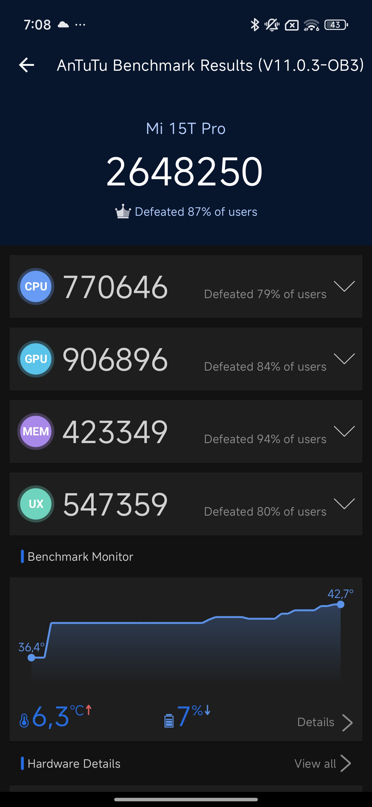 - AnTuTu v11: 2 648 250 punktów, z czego ponad 900 000 przypada na GPU, co jasno pokazuje, że to nie tylko procesor do pracy, ale i do grania