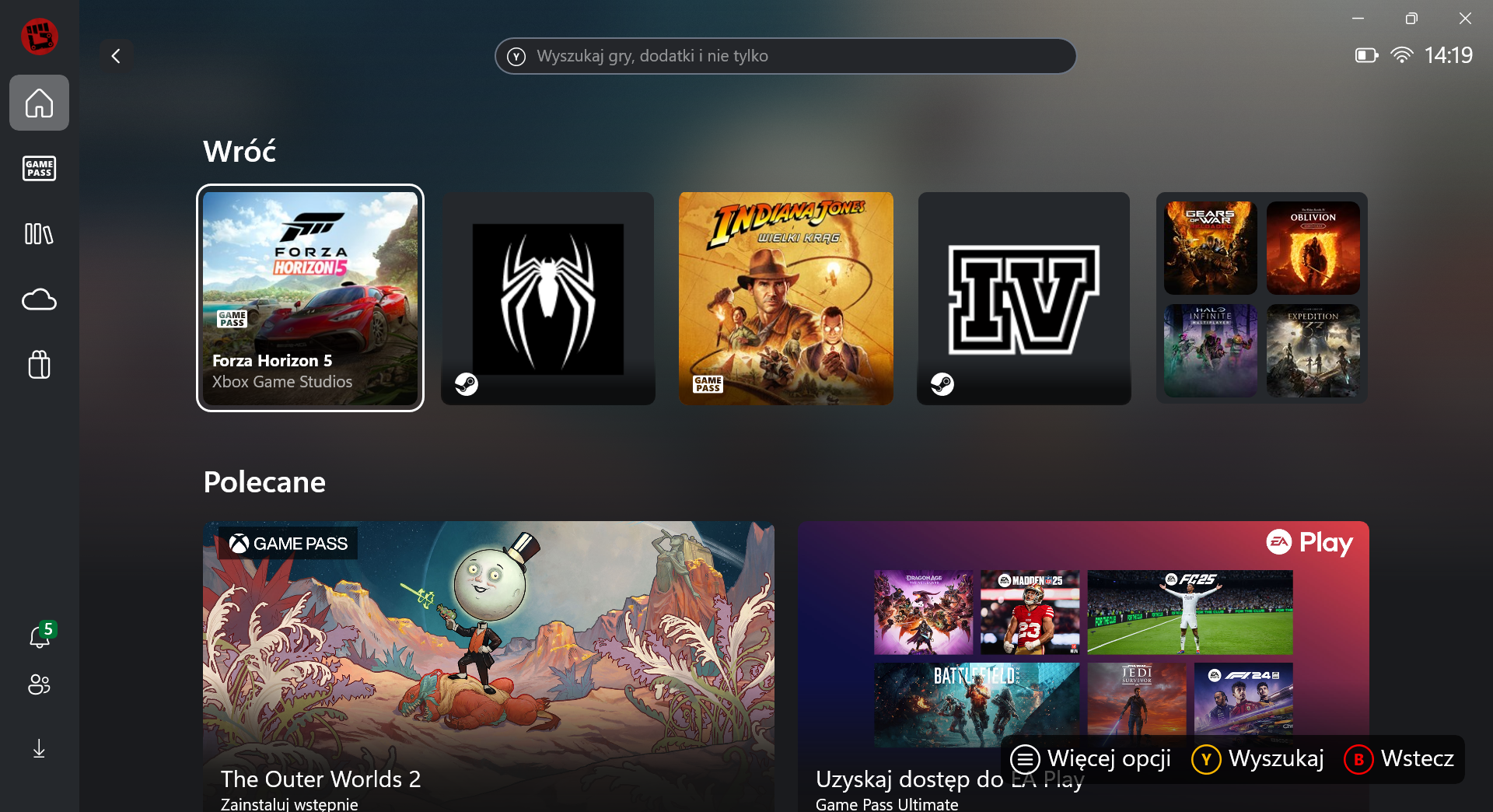 XFE nie zamyka nas w ekosystemie jednej platformy. W aplikacji znajdziemy skróty do Steam, Epic Games Store czy GOG. Po pierwszym zalogowaniu wszystkie są widoczne bezpośrednio w XFE, więc przełączamy się między tytułami i launcherami z poziomu tego samego UI - bez konieczności ciągłego oglądania pulpitu czy w ogóle przeskakiwania do osobnych aplikacji. Oczywiście można to zrobić, z czego zresztą sam chętnie korzystałem, bo lubię wygląd i używanie Steam Big Picture. Natomiast nie było to konieczne. Samo przeskakiwanie między aplikacjami jest natychmiastowe i są one jakby "zawieszone" w systemie, co w znacznym stopniu przypomina konsolowe patenty. Ogólnie jestem bardzo pozytywnie zaskoczony. Co na pewno jest do poprawki, to niektóre funkcje dotykowe (czasem wszystko działa jak należy, czasem jednak nie) oraz... robienie zdjęć. Działa to tak samo, jak na konsoli, ale podczas grania, gdy wyskakuje powiadomienie o zrobieniu zdjęcia, to nagle odcina nam sterowanie i musimy raz jeszcze nacisnąć bumper czy przycisk. Po chwili, gdy powiadomienie znika, dzieje się dokładnie to samo. Niby głupota, ale w takim BF6 czy Forzy Horizon 5 potrafi nas to skutecznie wybić z rytmu.