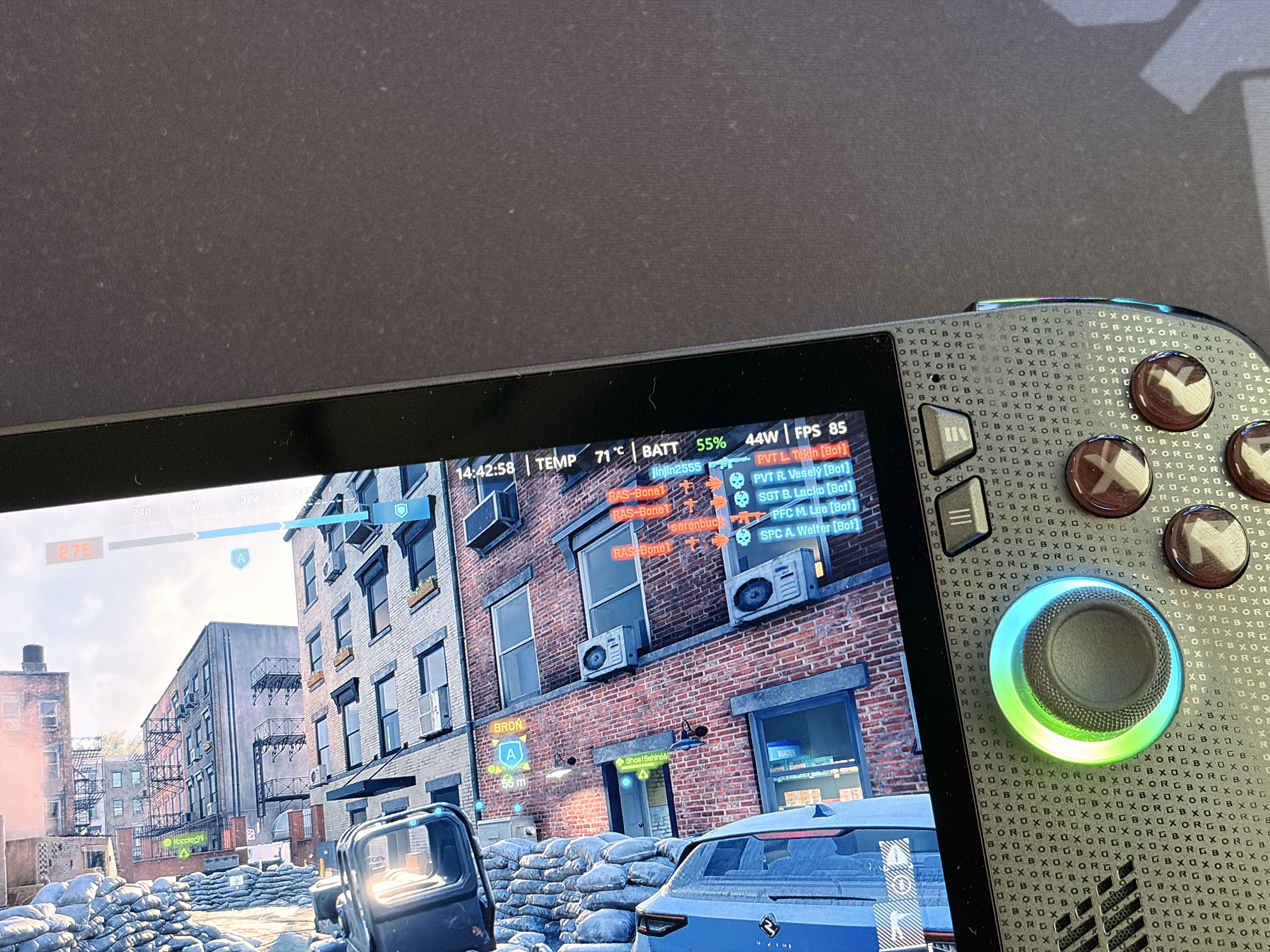 Podczas długiego grania i co za tym idzie, obciążania sprzętu cały czas, maksymalna temperatura całego układu sięgnęła 73 stopnie, a to w mojej ocenie wynik fenomenalny jak na tego typu sprzęt. Konsola w trybie Turbo (25 W) jest przy tym stosunkowo cicha. Słyszalny lekki szum wentylatorów, ale to poziom znacznie niższy niż u konkurencji, jak choćby w Lenovo Legion Go 2, który bywa znacznie głośniejszy przy podobnym obciążeniu.