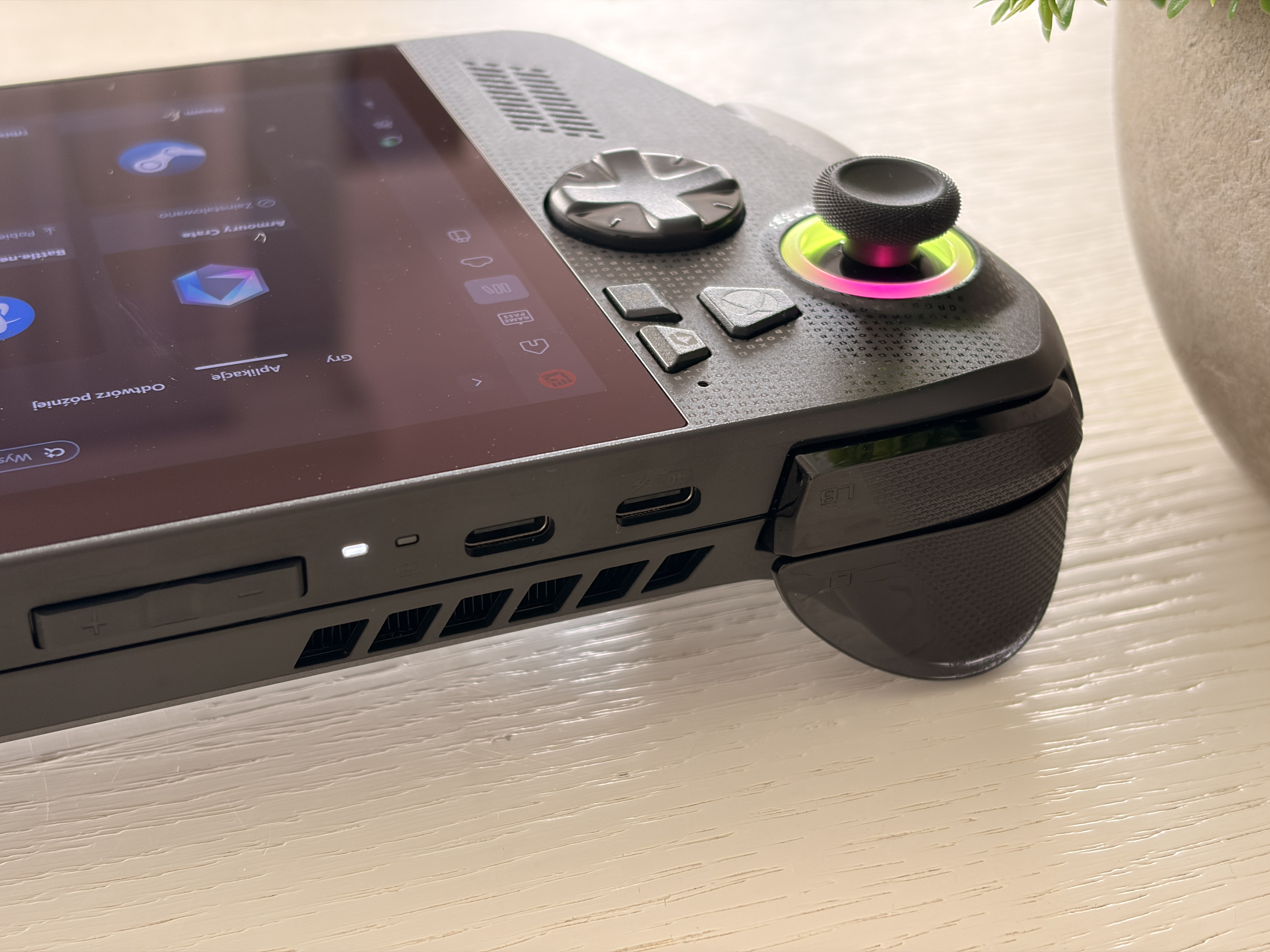 Za to ogólnie przyznam, że pod względem wykonania ROG Xbox Ally X to sprzęt klasy premium, idealnie zmontowany i dopieszczony w drobnych detalach. Od faktury plastiku, przez solidne spasowanie elementów, po charakterystyczne podświetlenie analogów. Wypada to znakomicie, a w dłoniach leży znacznie lepiej niż większość konkurencji. Na górze znajdziemy też dwa złącza USB-C (jedno do ładowania o mocy 40W), slot na kartę microSD, regulację głośności czy włącznik. Są też dwa wywietrzniki gorącego powietrza, ale do ich działania i samej kultury pracy sprzętu przejdziemy w dalszych sekcjach.