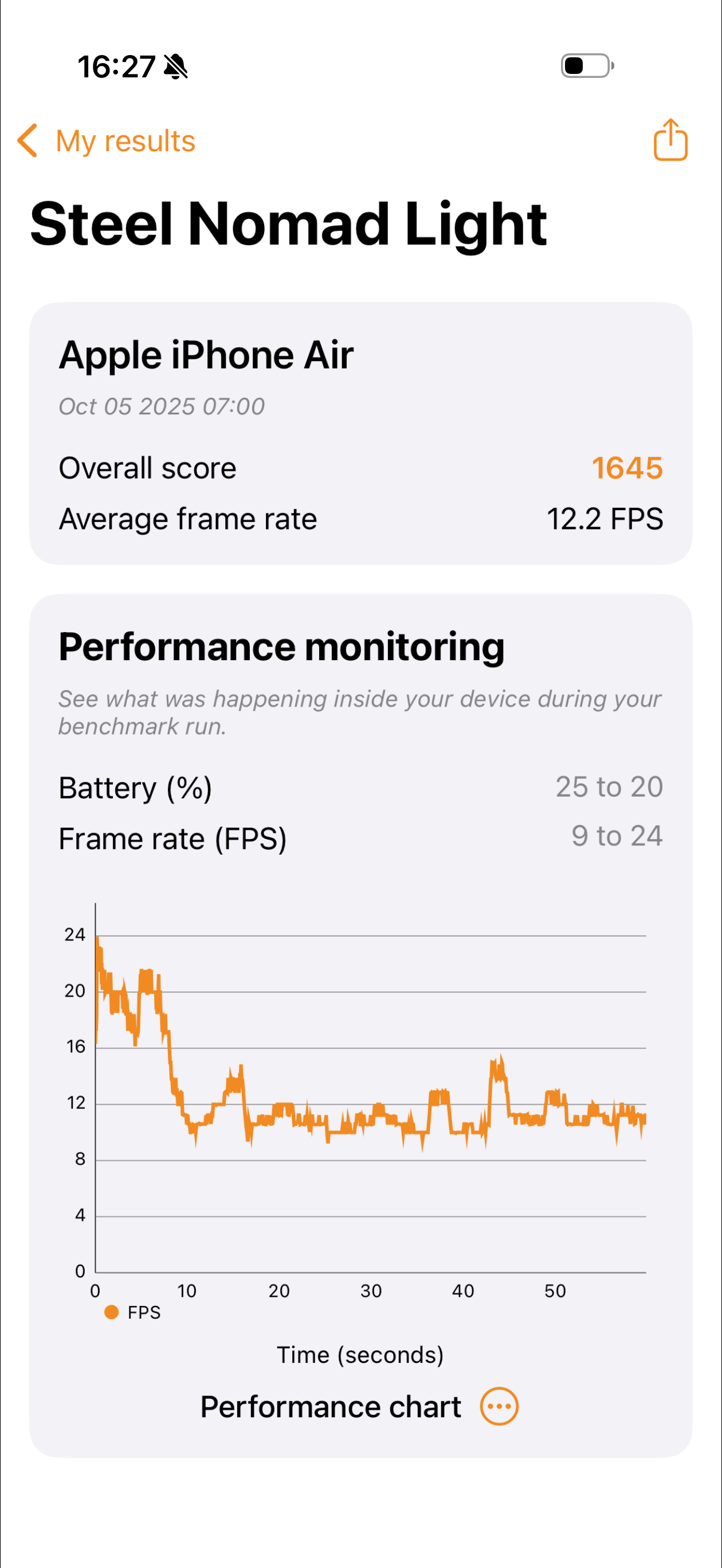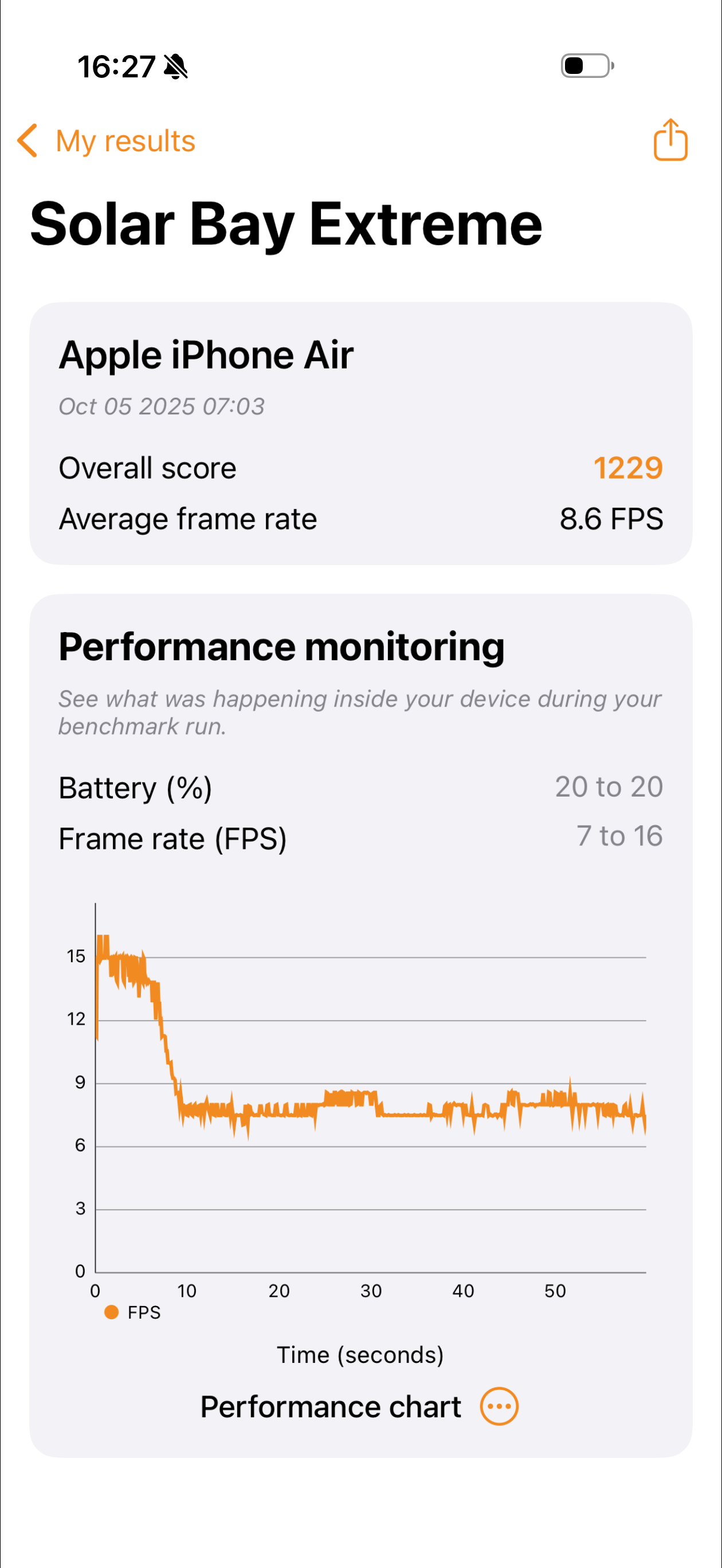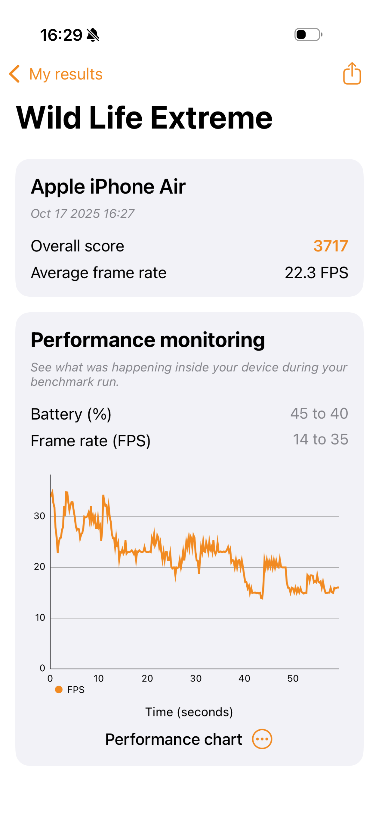 Co więcej, iPhone Air utrzymuje wysoką kulturę pracy - nawet podczas kilku dłuższych sesji temperatura obudowy nie przekroczyła u mnie 44 stopni, a throttling pozostaje delikatny i przewidywalny. W porównaniu z Galaxy S25 Edge, który w dłuższych testach potrafi zbijać taktowanie o 20-25%, Air zachowuje płynność i responsywność przez większość czasu. W grach wykorzystujących ekran 120 Hz (np. Dead Cells, Alto’s Odyssey 2) urządzenie zachowuje stały rytm, a nowy ekran OLED o tej częstotliwości idealnie współpracuje z silnikiem Metal. Do tego szybka pamięć (ok. 3,3 GB/s odczytu, 3,0 GB/s zapisu) sprawia, że czasy ładowania gier są zauważalnie krótsze niż w większości konkurentów z Androidem. Wszystkie aplikacje wczytują się czy instalują momentalnie - jak wspominałem przy okazji testów poprzedników, bo tu jest to samo - wbudowana w iPhone Air pamięć na dane użytkownika jest jedną z najszybszych na rynku.