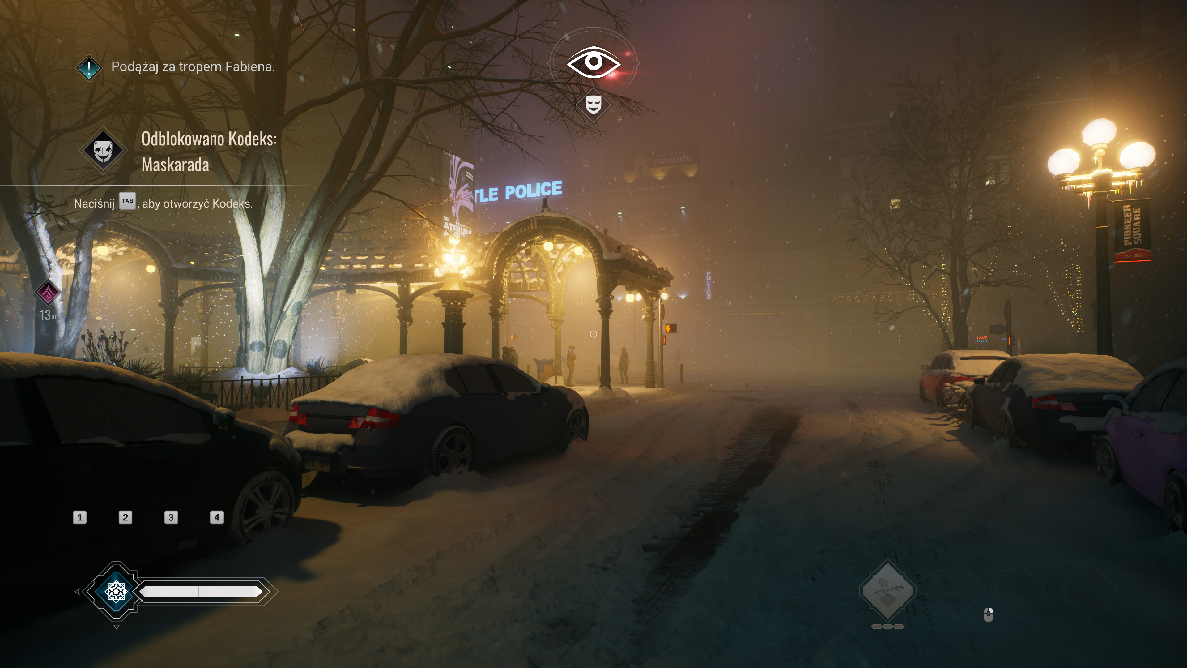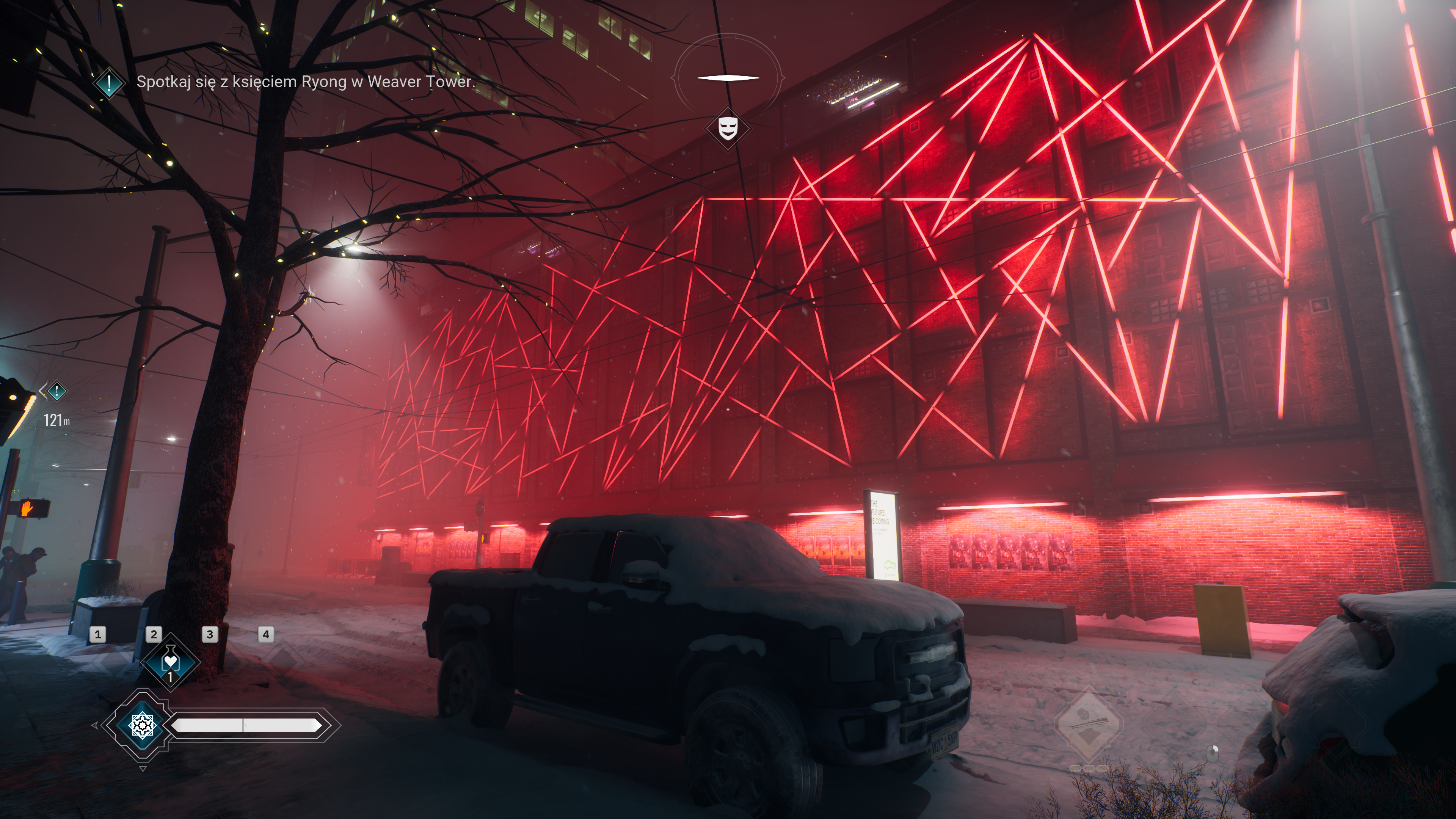 Projekt oświetlenia robi ogromną robotę. Czerwone i zielone światła, które przebijają się przez śnieg i parę wodną, nadają grze filmowy charakter. Lokacje takie jak Weaver Tower, podświetlone geometrycznymi wzorami z neonów, wyglądają jak kadry z cyberpunkowego thrillera. Korytarze wewnątrz biurowców i laboratoriów zalane złotem lub jaskrawą czerwienią mają własny rytm i intensywność - chwilami wręcz teatralną. Widać, że The Chinese Room potrafi budować narrację światłem, nawet jeśli tekstury i geometria bywają uproszczone. To, co zaskakuje, to konsekwencja wizualna. Gra nie stara się być fotorealistyczna, ale ma spójny język wizualny – trochę artystyczny, trochę stylizowany. Ulice są pełne kontrastów - raz duszne, klaustrofobiczne i zimne, innym razem szerokie i melancholijnie puste. W połączeniu z ambientową muzyką i subtelnym pogłosem miasta daje to wrażenie zanurzenia w świecie, który faktycznie oddycha nocą.