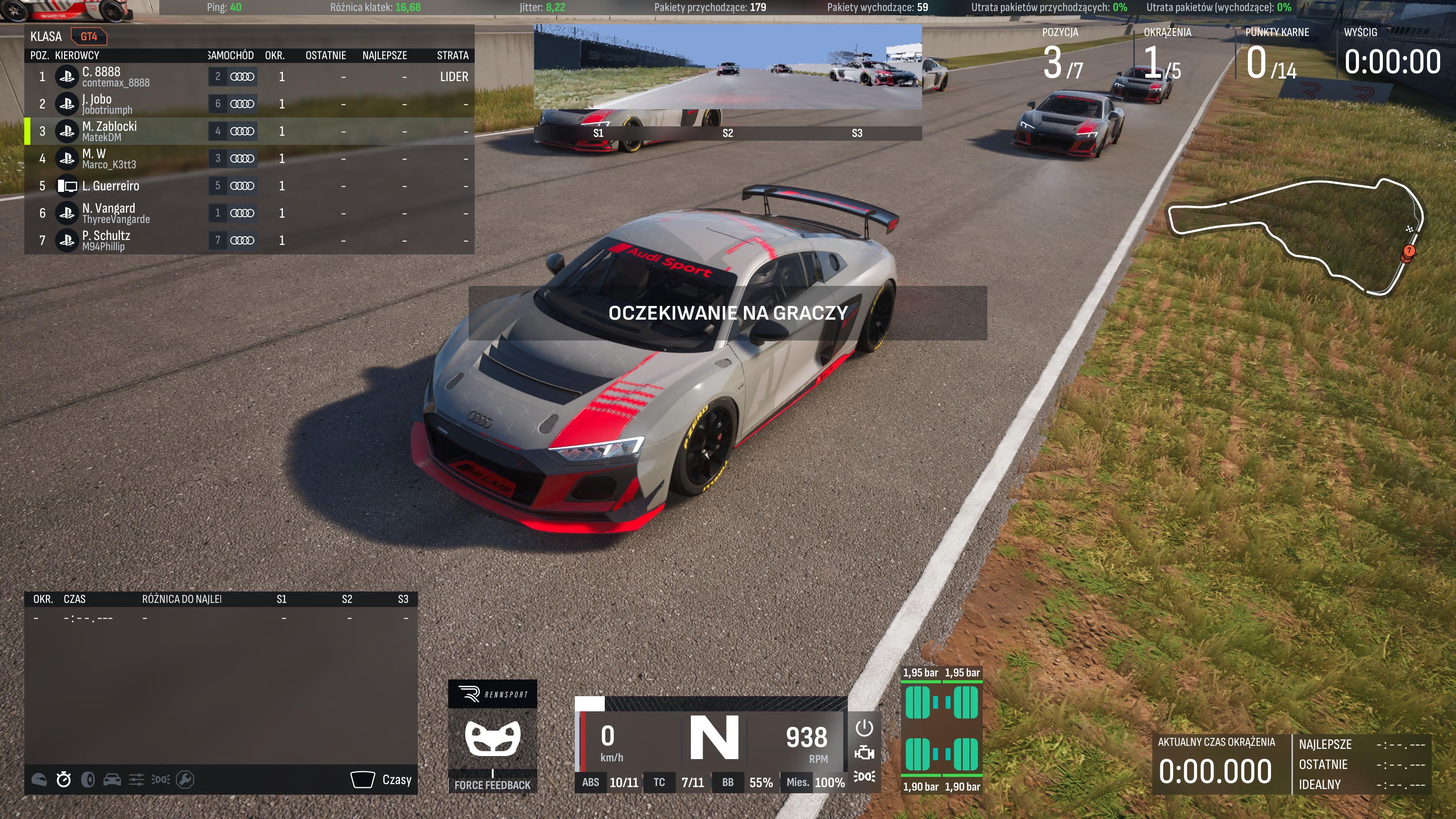 W symulatorze wyścigowym wszystko i tak sprowadza się do jednego pytania - jak wypada model jazdy? Tutaj Rennsport na początku potrafi zrobić bardzo dobre wrażenie. Samochody mają realną masę, przy hamowaniu czuć przeniesienie ciężaru na przód, przy wyjściu z zakrętu tył siada tak, jak powinien. Opony nagrzewają się, a przegrzane od razu wpływają na przyczepność. Wyjście na tor na zimnym komplecie jest czymś więcej niż kosmetyczną sugestią czy ikonką w menu, bo naprawdę trzeba dać im chwilę na złapanie temperatury. Na kierownicy (którą specjalnie dla Rennsport pożyczyłem od swojego wujka, fana Gran Turismo 7) da się wyczuć progresję uślizgu, balans między przodem, a tyłem, reakcję auta na przeniesienie gazu i hamulca w połowie łuku. To nie jest zręcznościówka z doklejoną etykietką „sim”, ale pod spodem faktycznie siedzi sensowny model fizyczny.
