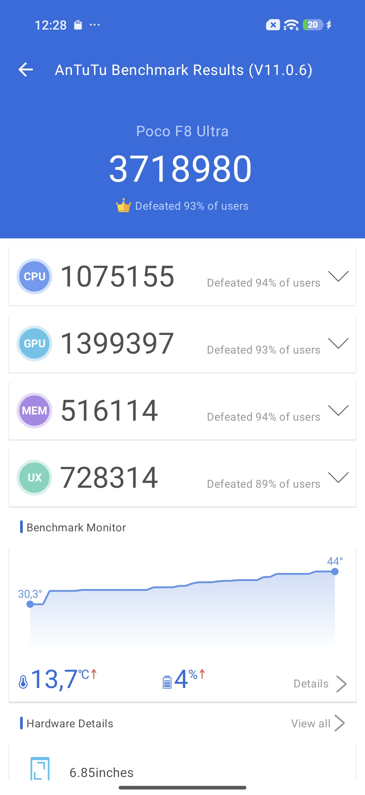 Weryfikacja wydajności w benchmarkach syntetycznych przynosi rezultaty, które jeszcze rok temu wydawały się nieosiągalne dla urządzeń mobilnych. W teście AnTuTu v11 POCO F8 Ultra regularnie przekracza barierę 3,7 mln punktów. To stawia go w absolutnie flagowej półce, w tym samym szeregu co OnePlus 15 czy Oppo Find X9 Pro. Przypomnę, że jedynym smartfonem, który w moich pomiarach zdołał przebić barierę 3,9 mln punktów, był wspomniany wcześniej Realme GT8 Pro. W testach procesorowych Geekbench 6, F8 Ultra notuje wyniki na poziomie 3200 punktów dla jednego rdzenia i blisko 10500 punktów w teście wielordzeniowym, co gwarantuje zapas mocy obliczeniowej wystarczający na kolejne 4-5 lat ewolucji oprogramowania.