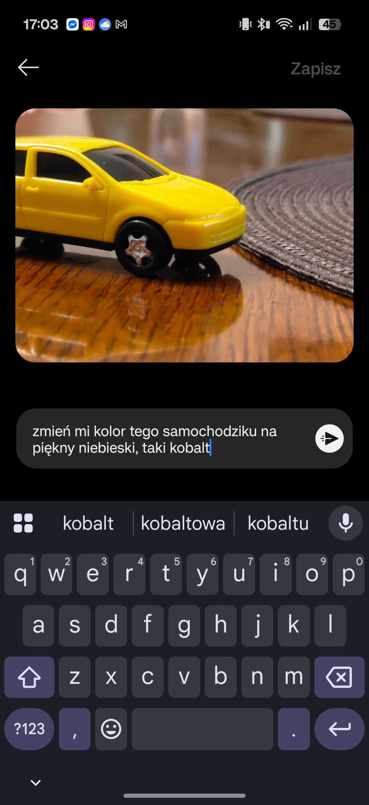 Przykłady wygenerowanych obrazów zgodnie z komendami (mój brat chciał dostać Bentleya w prezencie)