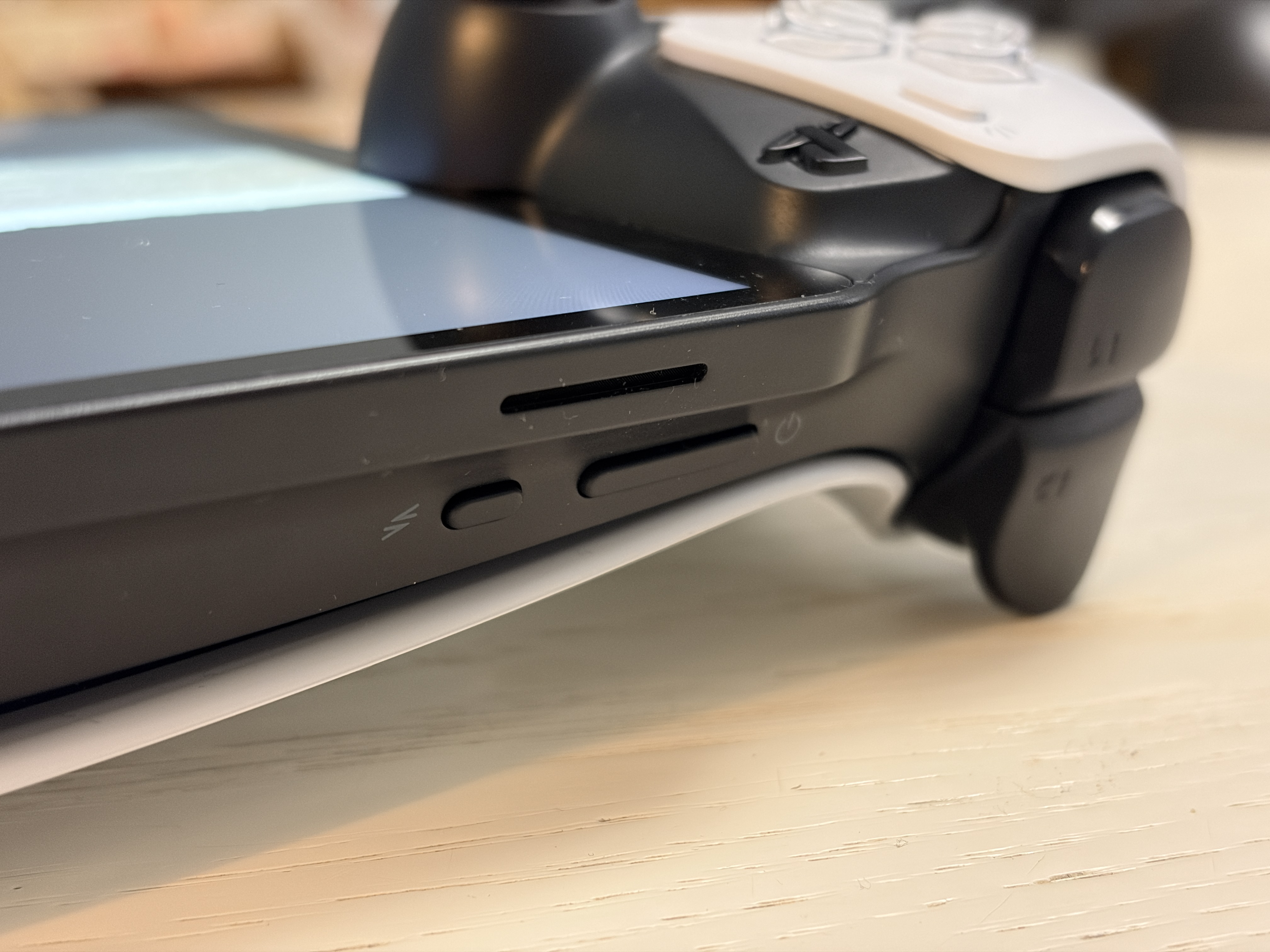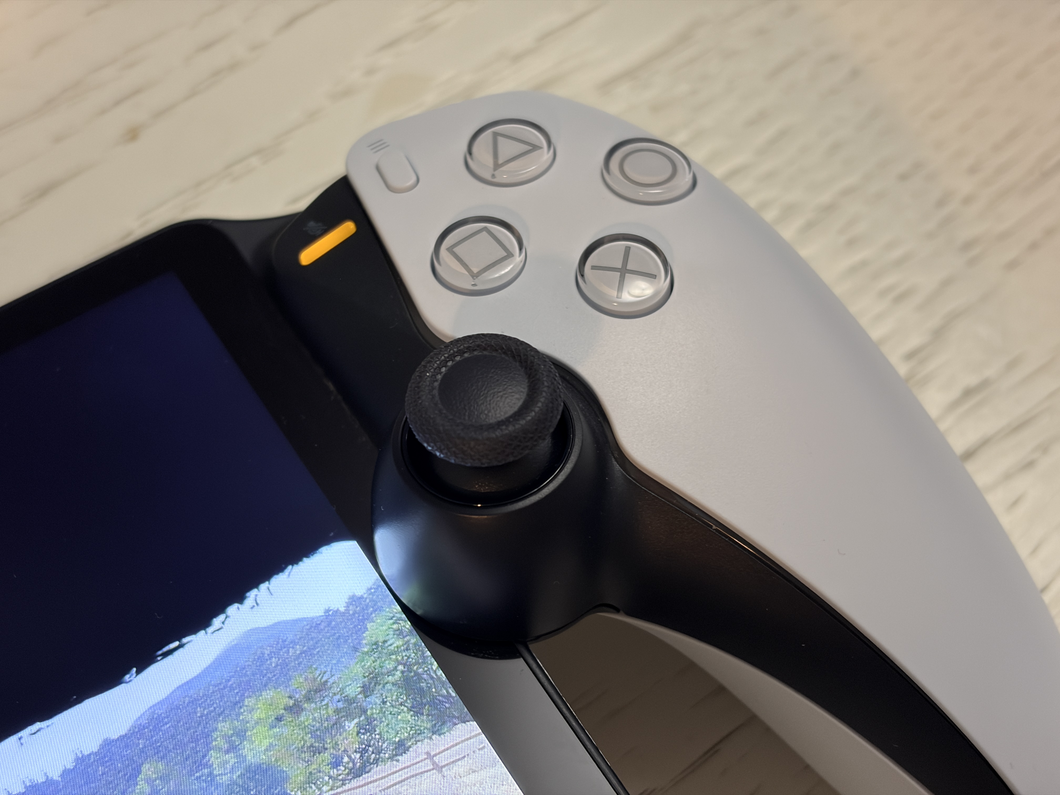 - Konstrukcja oparta na przeciętym padzie DualSense to strzał w dziesiątkę pod względem chwytu. Urządzenie, mimo swojej wagi, leży w dłoniach doskonale, nie męczy nadgarstków i daje poczucie obcowania ze sprzętem solidnie wykonanym