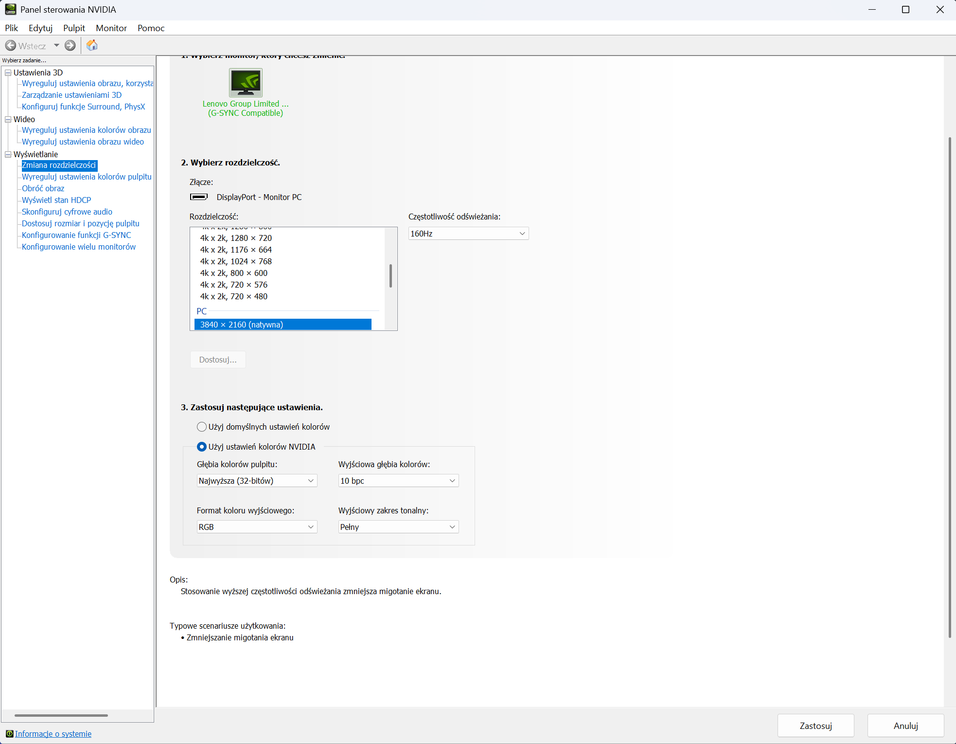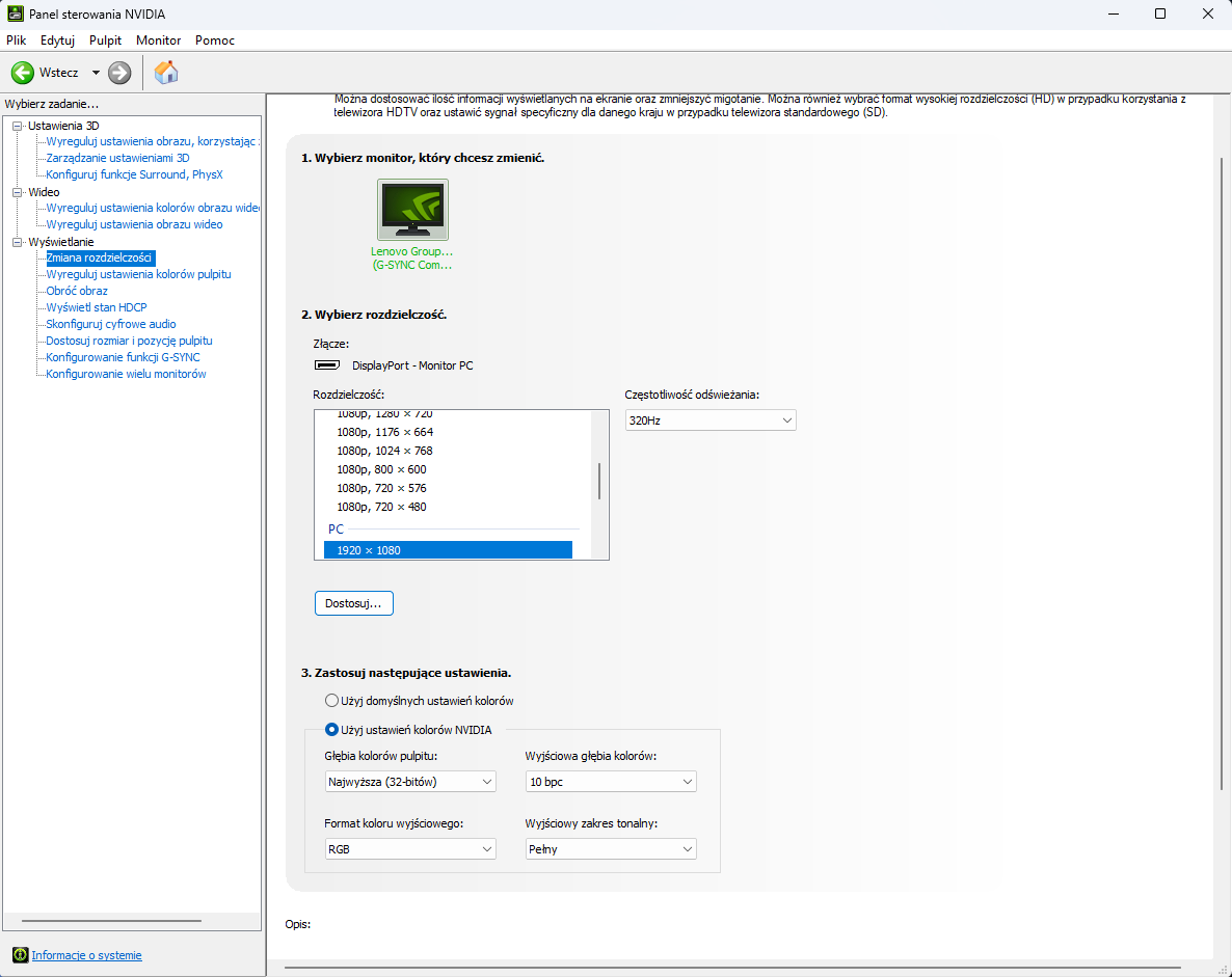 Proces przełączania między trybami jest maksymalnie uproszczony i sprowadza się do wyboru odpowiedniej opcji w menu OSD lub skorzystania z dedykowanej aplikacji Lenovo Artery (niestety w moim przypadku aplikacja nie potrafiła prawidłowo odczytać wartości monitora, być może zmieni się to w którejś z aktualizacji). Po zatwierdzeniu zmiany monitor na krótką chwilę gaśnie, by zainicjować nowy tryb pracy kontrolera obrazu. Technicznie mamy tu do czynienia z mapowaniem pikseli w stosunku 4:1 (cztery fizyczne piksele matrycy 4K tworzą jeden logiczny piksel w trybie FHD), co teoretycznie powinno zapewniać czysty obraz. Musicie jednak wiedzieć, że rozdzielczość Full HD na 27-calowej powierzchni zawsze będzie wiązała się z widoczną ziarnistością i spadkiem ostrości względem natywnego UHD. W dynamicznych strzelankach sieciowych, gdzie liczy się klatkaż, nie stanowi to problemu, jednak do gier przygodowych czy codziennej pracy biurowej, tryb 320 Hz jest po prostu nieefektywny i męczący dla wzroku.