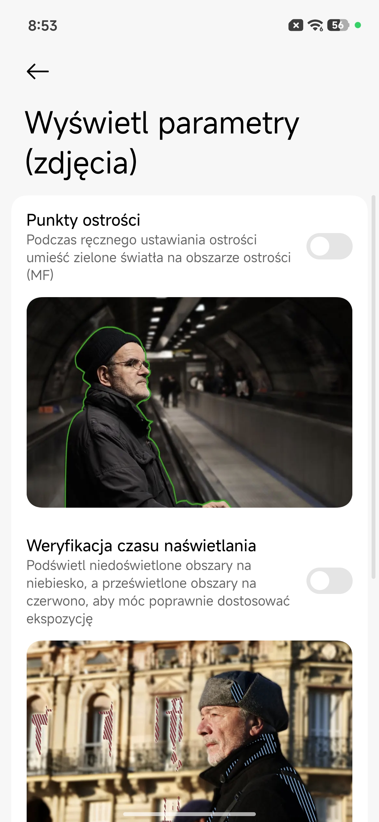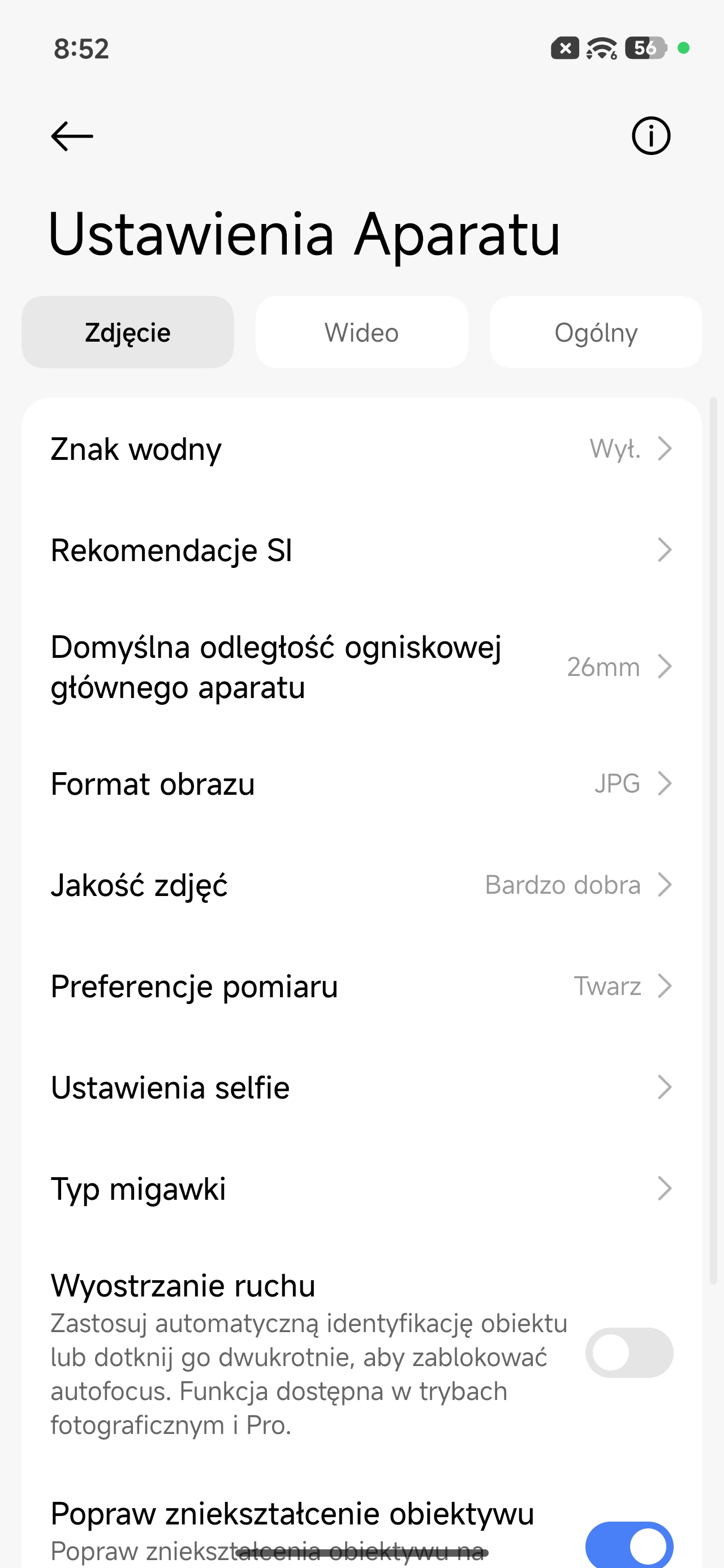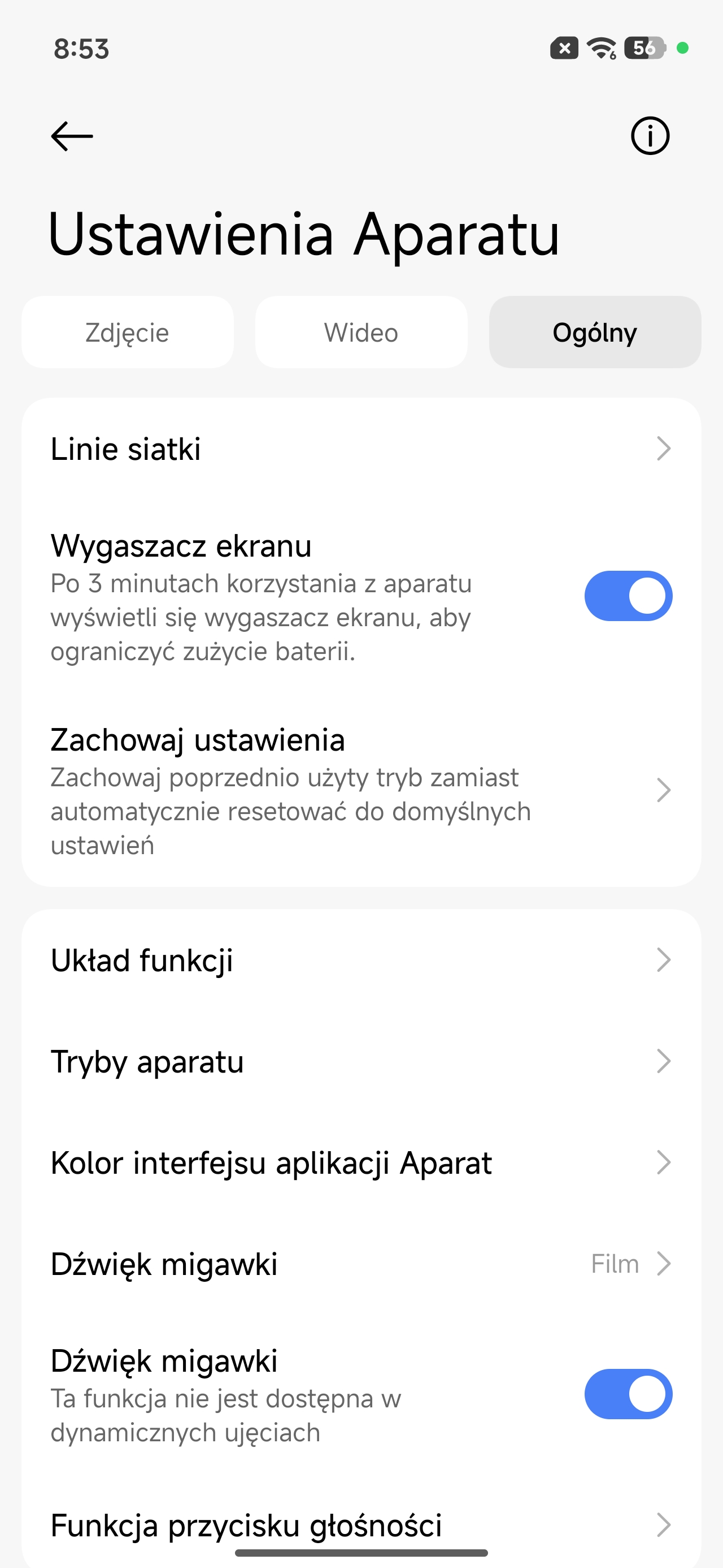 Wygląd aplikacji aparatu oraz dostępnych ustawień