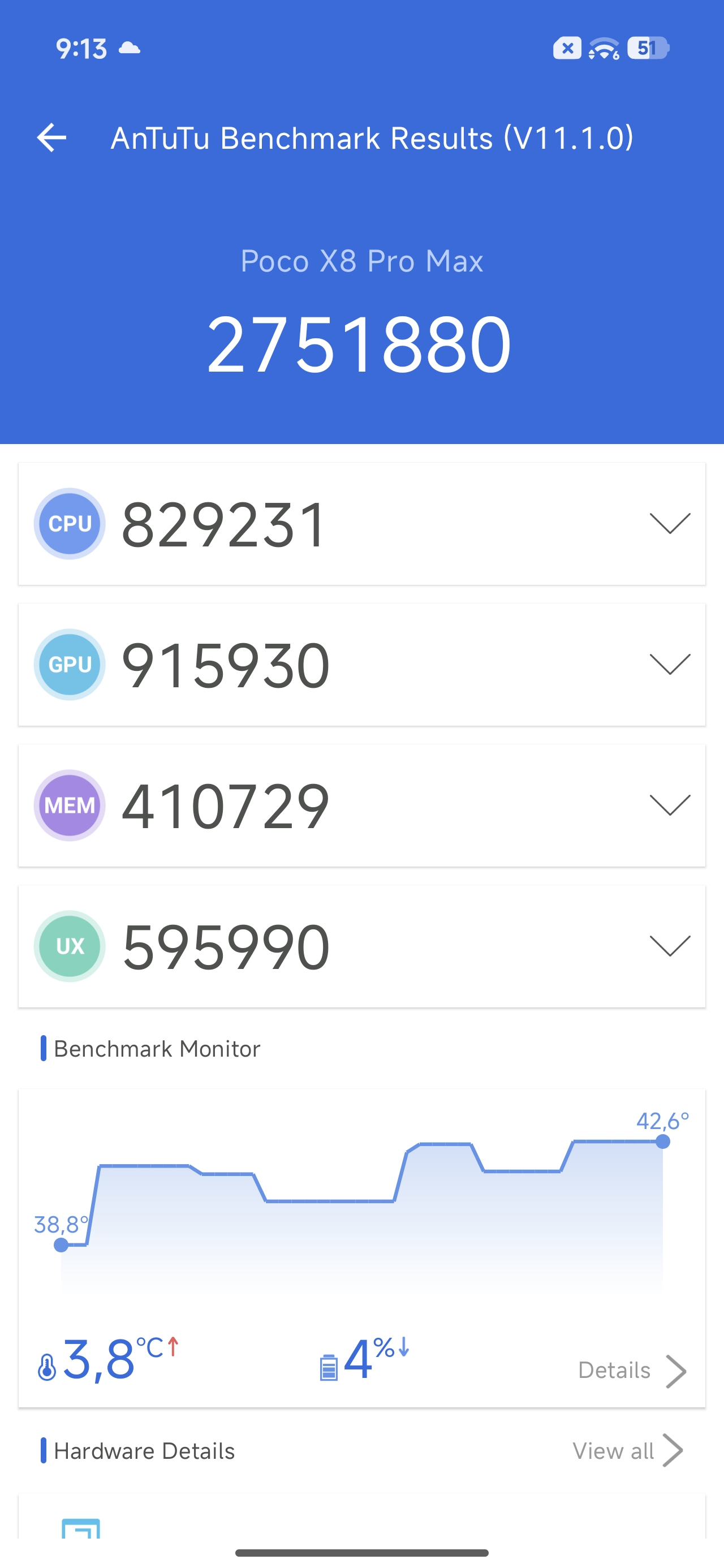 Sercem POCO X8 Pro Max jest MediaTek Dimensity 9500s, czyli układ, który w teorii miał być „tylko” bardzo mocnym średniakiem, a w praktyce okazuje się bestią rzucającą wyzwanie wszystkim zawodnikom w tej klasie. W moich testach syntetycznych smartfon wykręcił bardzo przyzwoite 2751880 punktów w AnTuTu. Szczególne wrażenie robi wynik GPU przekraczający 915 tysięcy punktów oraz sprawność pamięci RAM, która w teście MEM uzyskała ponad 410 tysięcy punktów. W codziennym użytkowaniu przekłada się to na absolutny brak jakichkolwiek opóźnień - system HyperOS 3 reaguje na polecenia natychmiastowo, a przełączanie się między kilkunastoma otwartymi aplikacjami odbywa się bez przeładowywania ich zawartości. Co ważne, urządzenie ma aż 12 GB pamięci RAM, więc nie będziemy w żadnym przypadku odczuwać "zmęczenia" smartfona przy dziesiątkach kart w przeglądarce i kilku otwartych aplikacjach jednocześnie.