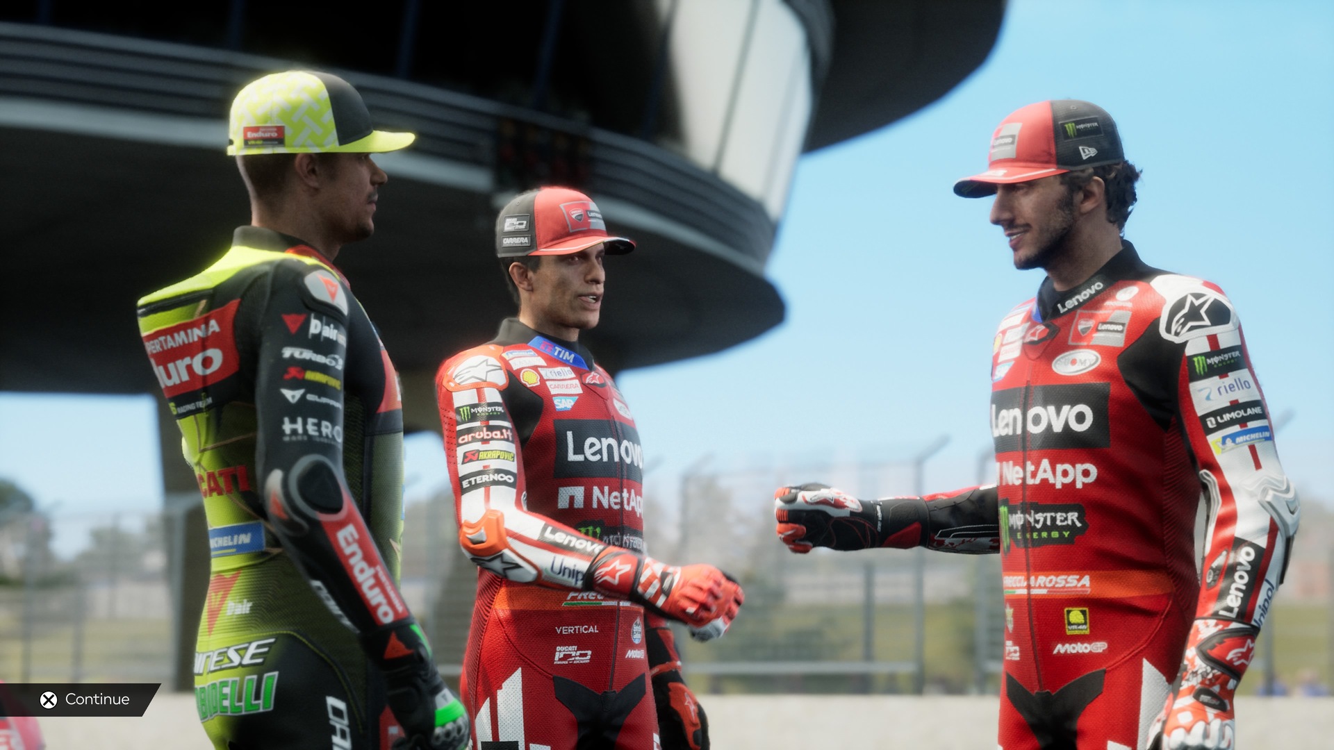 Jeśli chodzi o grafikę w recenzowanym MotoGP 26 – cóż, nadal mamy wprowadzony w zeszłorocznej odsłonie silnik Unreal Engine 5, co moim zdaniem nie spowodowało żadnej rewolucji, a nawet sprawiło, że cykl wygląda trochę mniej atrakcyjnie. Natomiast pewne elementy, takie jak wygląd czy mimika twarzy zawodników, pozostają niezmienione chyba od paru lat – szkoda, że tytuł nie doczekał się w tym względzie odświeżenia. Raz na jakiś czas gra ma także problemy z kamerą – na przykład gdy ustawiłam sobie widok z kasku, kawał tekstury odpowiadającej za ów kask zasłaniał mi przez chwilę pół ekranu. To jednak zdarza się dość rzadko.